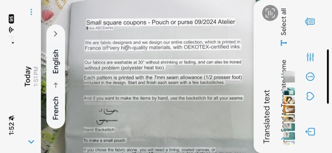After a second or two, all the French is in English (I chose the language, but you could choose any). I learned a “coupon” is a “pouch” or maybe “fabric” or not (it’s not always perfect). So I went to the section about the corners, but alas, still couldn’t figure it out. I then went to math, something we quilters are good at. If the fabric measured X by X then I used the larger dimension, and if it was a different X by X, I would use the smaller. I measured the printed fabric, which gave me my answer. (I’m using “X” so I don’t give away her pattern.) I’m just saying, don’t be frustrated, but try another angle to solve your translation difficulty. Onward.