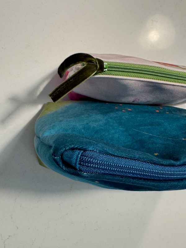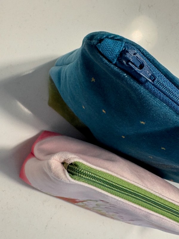 Notice how wonky the zipper ending is on the pink? I mean, it’s functional, but not as lovely as the blue zipper. I chalk it up to how the top-stitching impeded the inner seam. (I need to find a cute ribbon for the blue bag.)