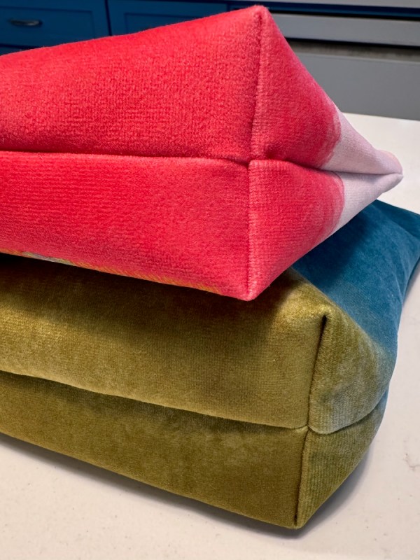 Since this is a velvet minky, I didn’t want to put a hot iron on it and scorch it, so I found my roller came in handy for flattening the seams. On the pink pouch, I opted to topstitch down the fabric with the zipper (she gives two options). I won’t do that again — in a minute I’ll show you why. [Of course it could be that I’m a dweeb at sewing pouches, and the results have everything to do with that.]