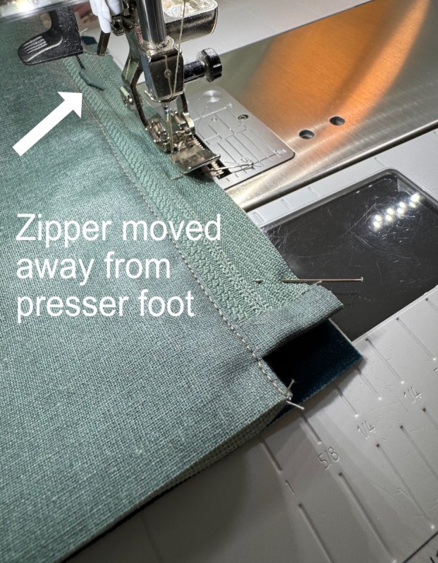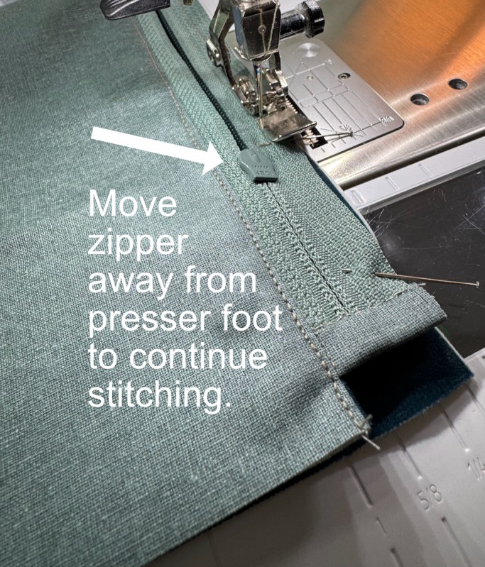 In the first photo, the designer fabric is shown smoothed away to the left, away from the stitching going on on the lining/zipper tape. As usual, when your presser foot approaches the zipper pull, leave the needle in the fabric, raise the presser foot slightly, and move it to the back where you’ve already stitched. This will eliminate bumps in the stitching line.