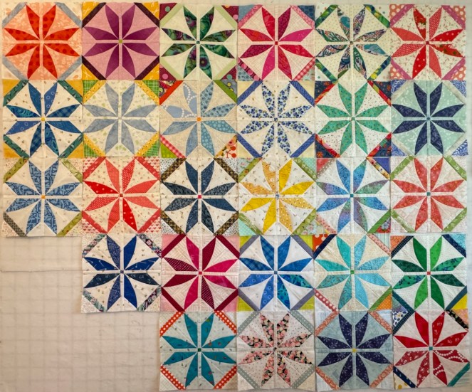 Here’s the group so far. 41 blocks are planned, and I’ve made 27, more than halfway. But I probably said that last time. You should see Carol’s stack — they are wonderful!!