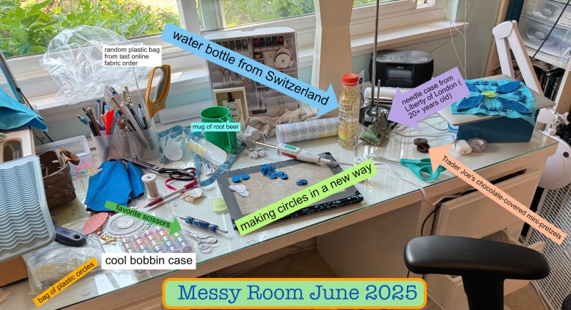 This is me, making a mess. It’s good to document messes once in a while. I was learning a new way of making circles. (Last post) I know these photos drives one of my friends crazy; she is a very tidy sewer, but her sewing room is also about 4x as big as mine; a lot of stuff gets piled up in mine. I have learned to focus and ignore the periphery, a skill I learned when I had four small children and had to get the quilt done: