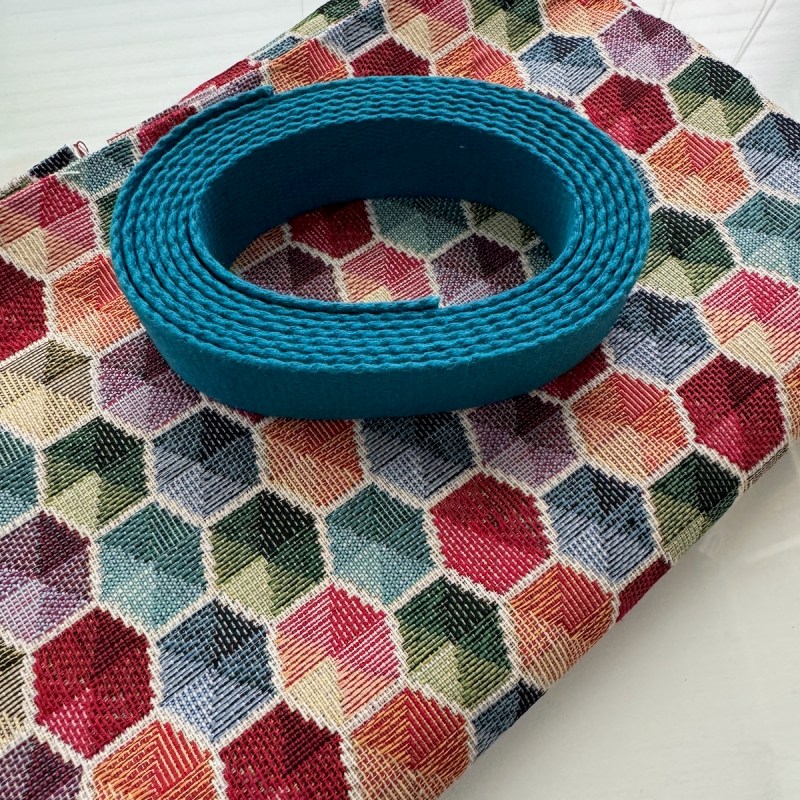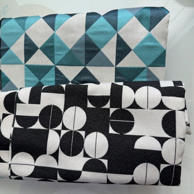 This table reminds me of what I purchased at our last stop at the Carrefour Quilt Show: a thick geometric woven tapestry, plus cotton webbing to match. Because of this, I’m drawn to the fabrics on the table.