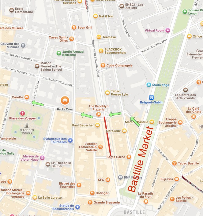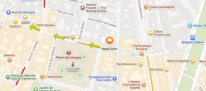 Thursday morning, after we went to the Bastille Market, we then walked down a neighboring street into the Marais District (follow the green arrows). We ate at Babka Zana, enjoying an amazing sandwich made on challah bread, and filling chicken salad on the side.