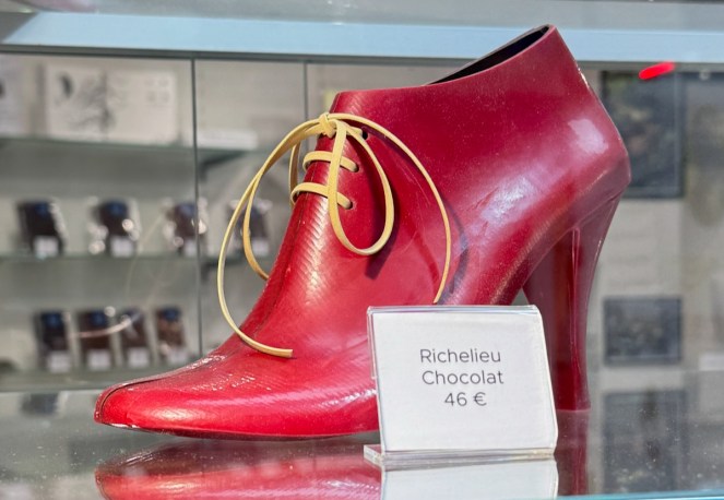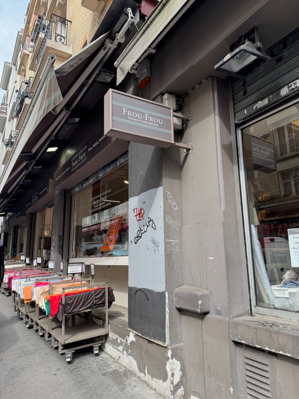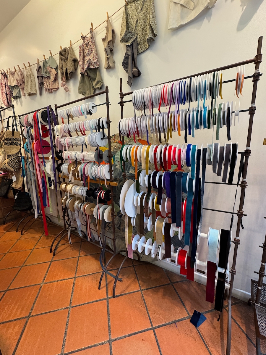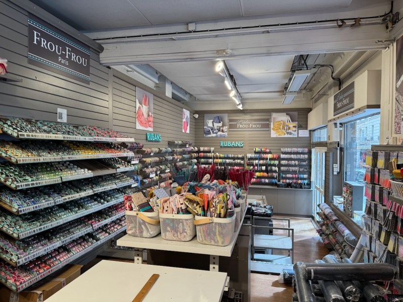 I could see through the window that Frou-Frou had ribbons. Many people speak English; my husband speaks French, so I brought the bolts of ribbon that I wanted to the front desk. Right there, she measured off what I needed — no walking to a neighboring counter this time — and rung me up.