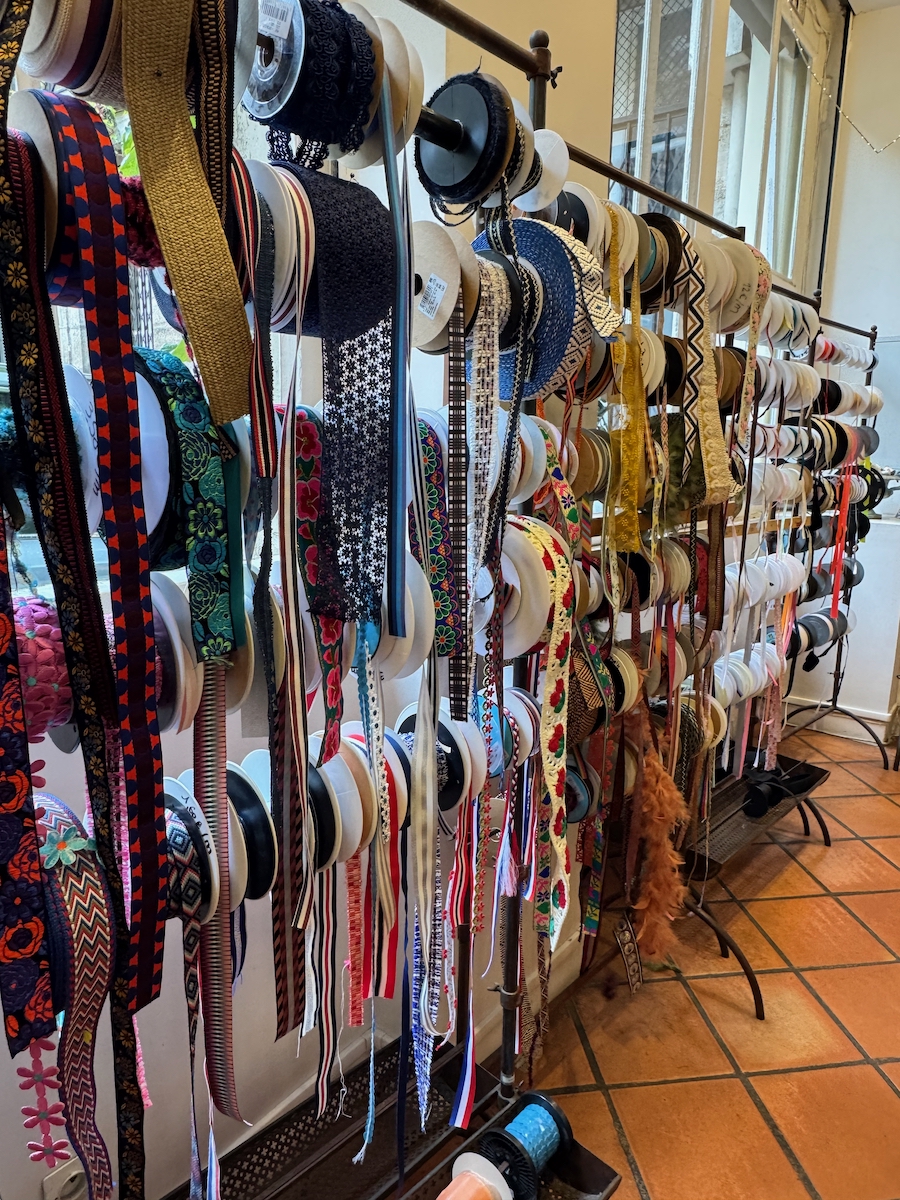 One morning, after stopping by the local boulangerie (this one was Bo & Mie, and that babka cannelle went right into the bag), we headed up to Montmartre, a hilly, historic district in Paris’ 18th Arrondissement. From a previous trip I knew that at the base of the Montmartre basilica were lots and lots of fabric (mercerie or tissus) shops. As I mentioned before, I only had one carry-on bag, so decided to focus on ribbons (ruban), as I was also carrying what small amounts I’d purchased in Alsace at Carrefour.