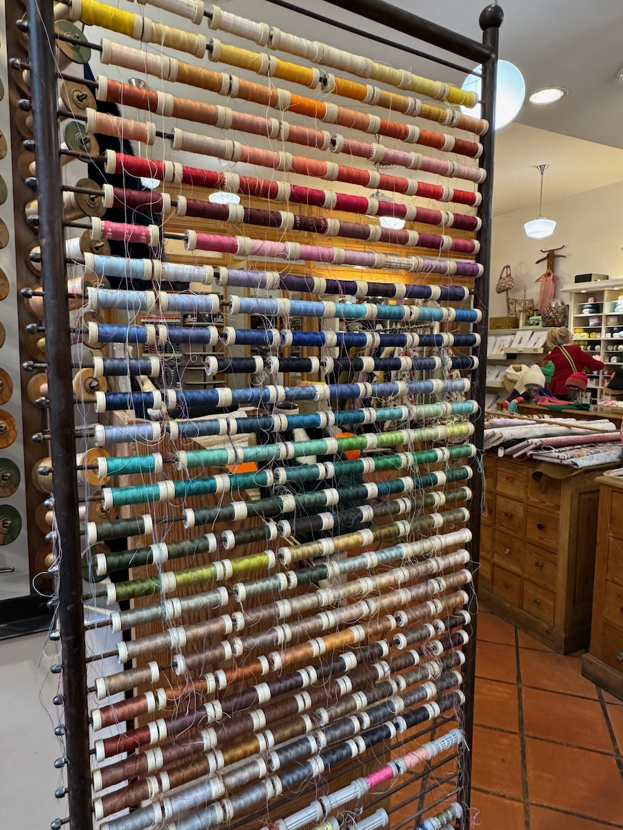 So much fun, so many ribbons. The last photo of threads on a rack is just for looks, she said. Real thread is….and she swung open a door to show all the threads. Tiny, but gorgeous. I purchased…white double-faced satin ribbon (again).