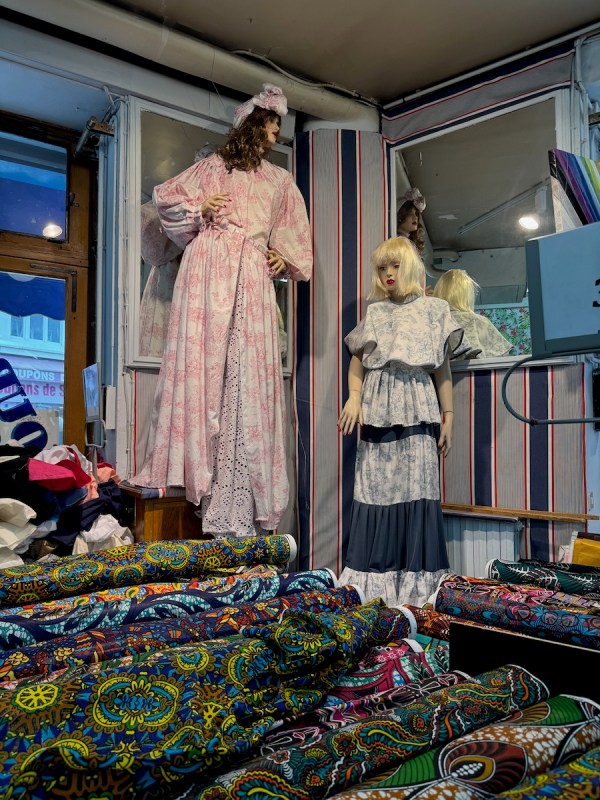 Given the weight of the tapestries in my backpack, I asked the shopgirl to cut some small pieces that they didn’t already have cut. “Non,” the girl said. “We don’t have those in smaller pieces.” Given that the yardage above was there and waiting, and that she obviously was not going to cut anything for me, we left without any of this fun fabric, and went down the street for a yummy Cambodian meal at Le Cambodge.