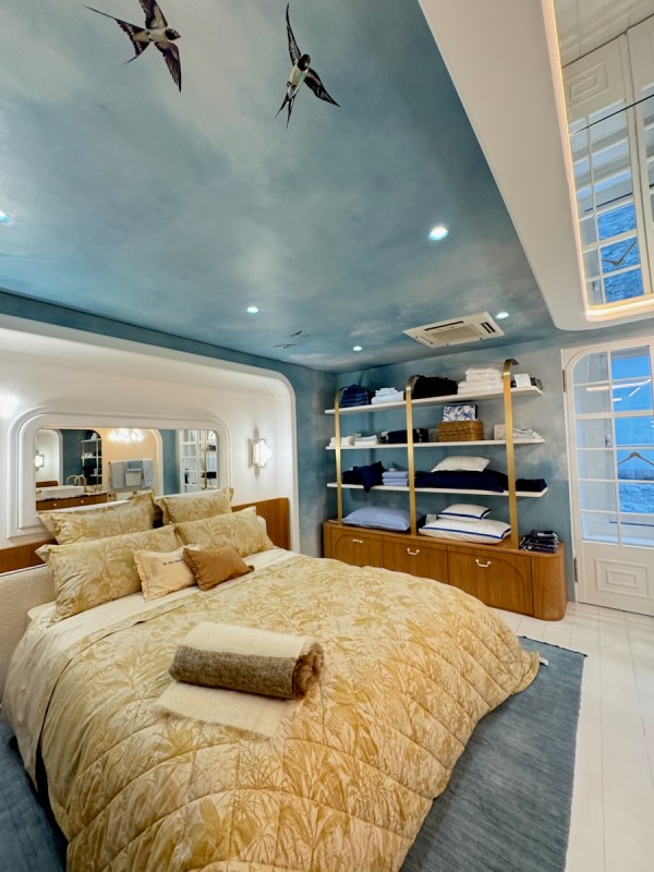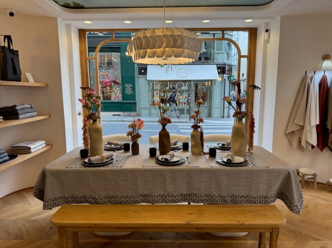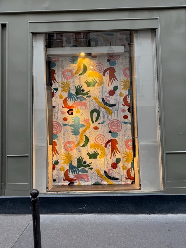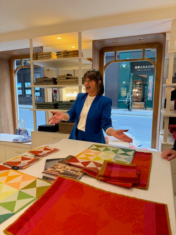 Julie, an owner of the shop here in Paris, agreed to pose for this shot for me: the cool blues of her suit against these poppy, yellow and bright colors. We bought two of the orange placemats and two of the Half-square Triangle placemats although she referred to them as “origami.” When I explained to her that I’d just been at a patchwork show in Alsace, and we called the pattern by a different name, she understood. “Ah! Patchwork!” she said.