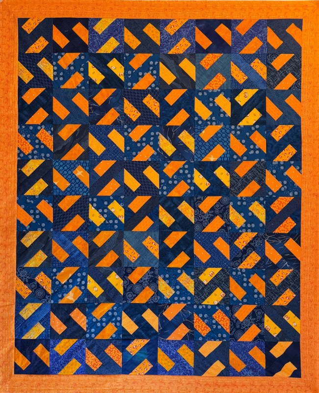 I’m standing underneath my quilt Azulejos, hanging in the gallery at Road to California in January 2020, before Covid-19 and all the Murder Hornets were released and when the world turned upside down. Well, I’ve been wanting to make this pattern in deep blues and cheddars, and I finished it this week.