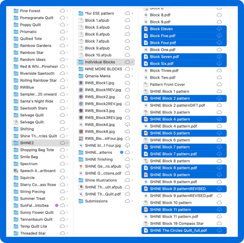 And yes, some pattern-writing has been delayed as I’m having to recreate the digital files that were lost (see illustration, above, of all that I lost in my Shine Circles patterns). I’m just glad it’s up online and free for the download if you click on the link.