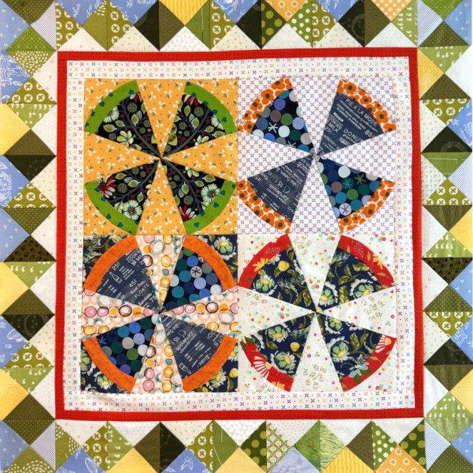 The top one is the hourglass borders sewn right up against the center block. The one just above on the left has a wider coping strip, and the one on the right has two (1″ and 1/2″), in different colors. I studied them for a long time. I liked the top one, with the hourglass right next to the center, as they interacted with each other. The wider coping strip — necessary because the blocks were 3″ finished — looked as if the center was floating, a bit adrift. So I went with the two colors (and my partner-in-crime, my husband, agreed).