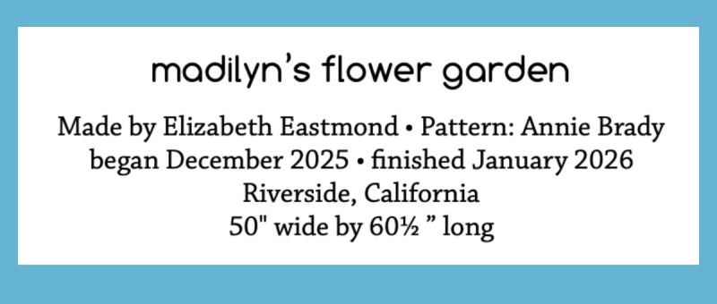 Thanks to my husband, Dave, for being a Quilt Holder, par excellance! This is quilt #313. If I’d written a normal label, it would have looked like this, but instead I went with a smaller one, sewn near the top.