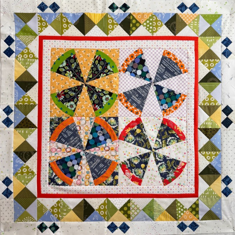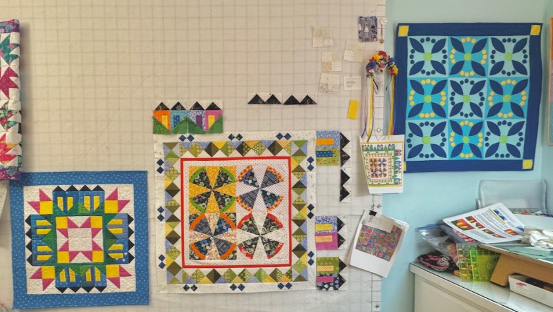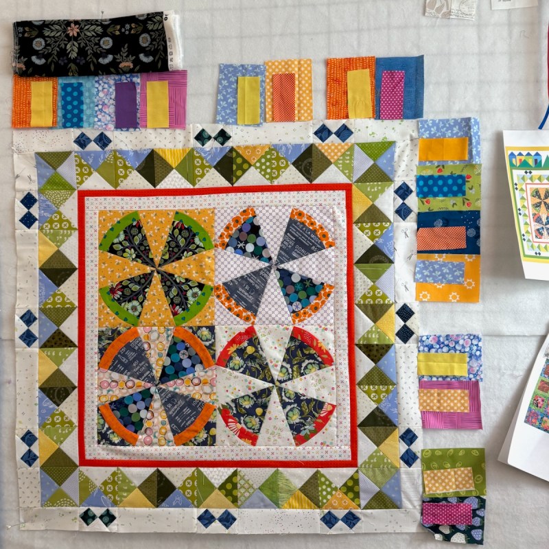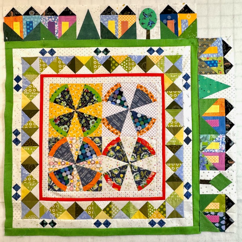 Here’s where I left it. I will sew the neighborhood to the slender green border, but I’m missing something for that upper corner. I had an idea (see the sketch at the top of the post), but after a week of double-construction and double-double borders, I was ready to let it rest, and see what our prompt is for Week Three.