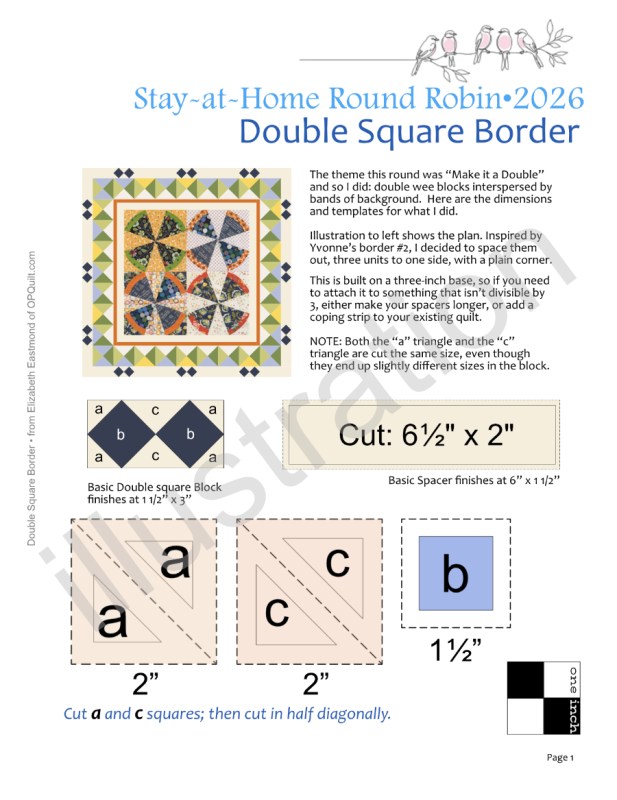 So while hammering, sawing, sheet-rocking, mudding, painting, electrical stuff was going on, I was trying to concentrate on the week’s SAHRR prompt. Kathleen suggested blocks with the word or idea of double. So I created a double block border: