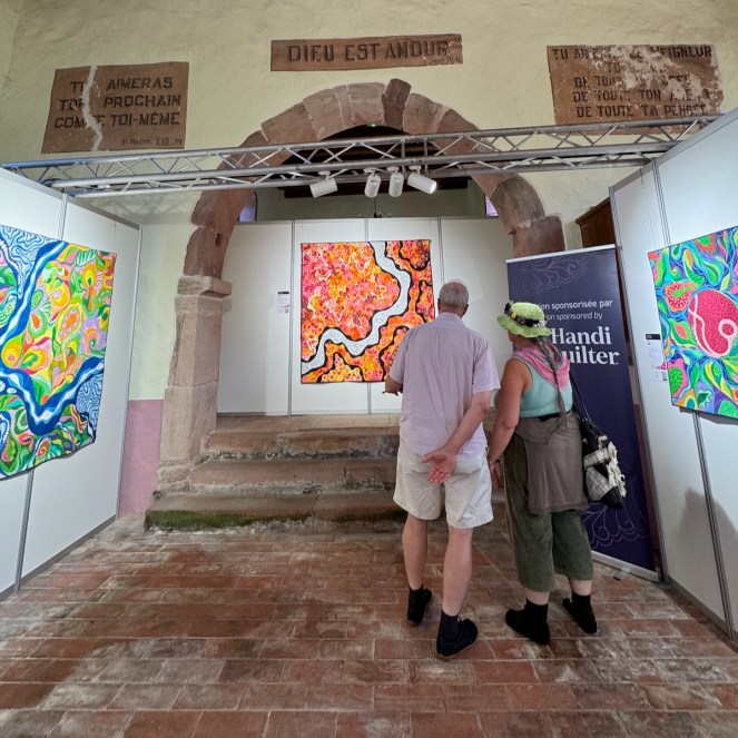 Now that the orientation is complete, the story is that last year my husband and I had a chance to go to the Carrefour European Patchwork Show in the Silver Valley, near Colmar France. That’s called the Val d’Argent, in France in the Alsace region, and yes, there is great food and beautiful countryside. One of the things we like about this show is that is spread out over four small towns in the valley, and they use churches and community centers and municipal buildings, so you really get a feel for being in that area.