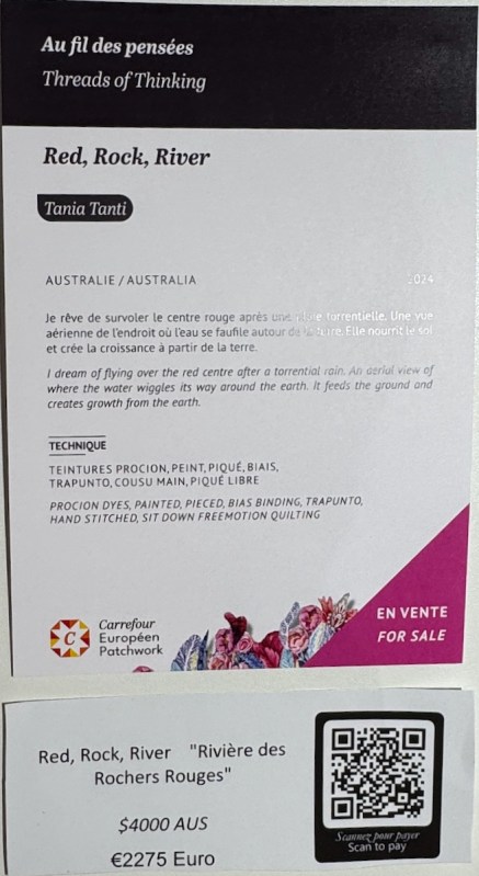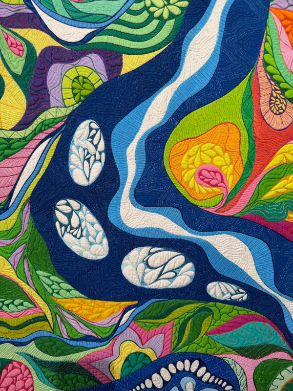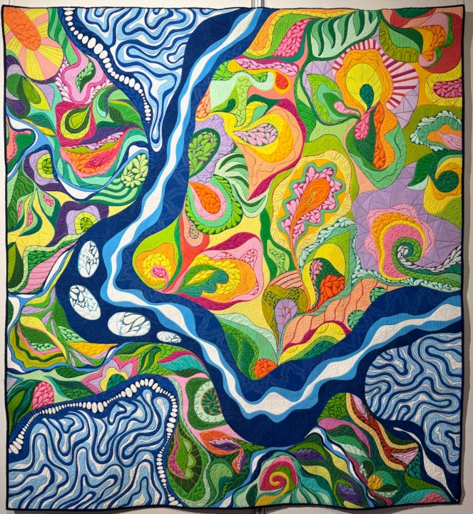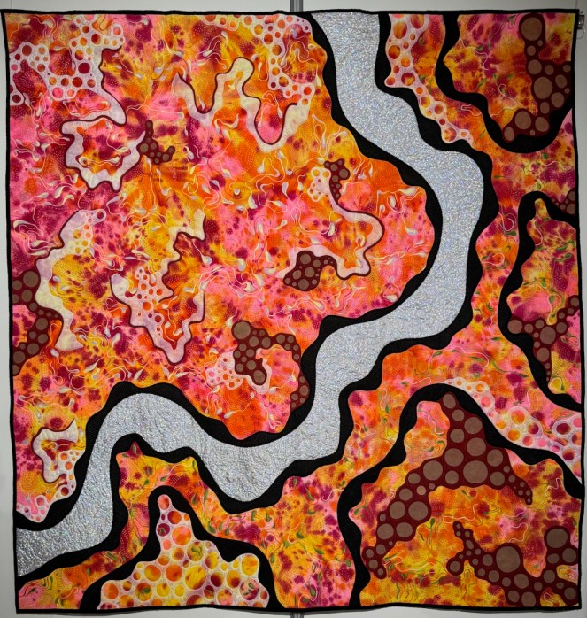 Red, Rock, River by Tania Tanti. She writes: “I dream of flying over the red centre after a torrential rain. An aerial view of where the water wiggles its way around the earth. It feeds the ground and creates growth from the earth.” In her technique section she writes: “Procion dyes, painted, pieced, binding, trapunto, hand-stitched, sit-down free motion quilting.”