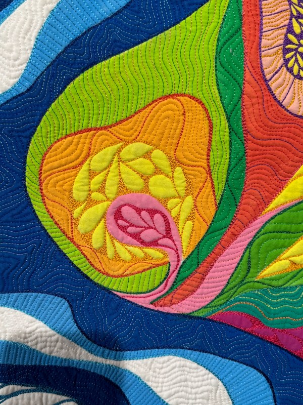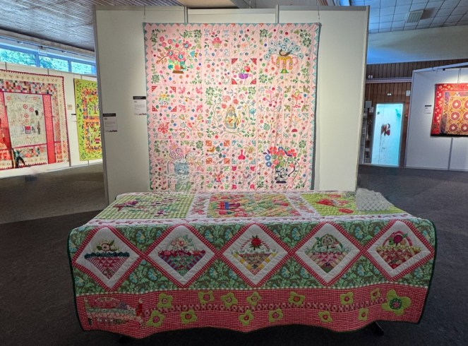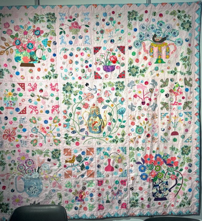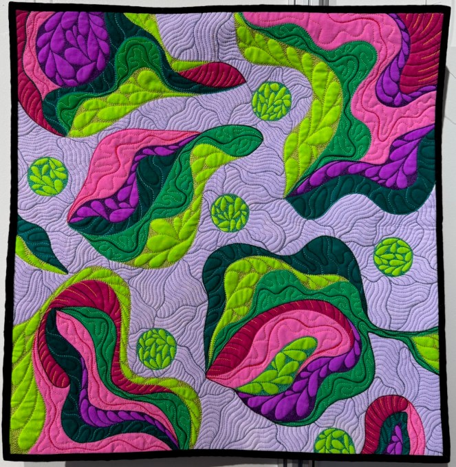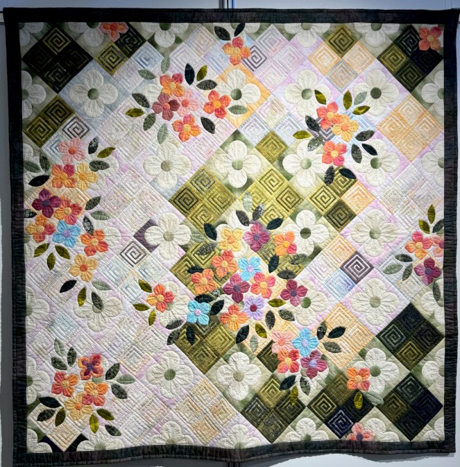 Fiona Lindsay is our last quilt artist for this post, but not the least! as they say. Also showing in Venue 12, her quilts were a veritable flower garden, a theme of hers, chosen carefully, as she loves sewing and she loves gardening.