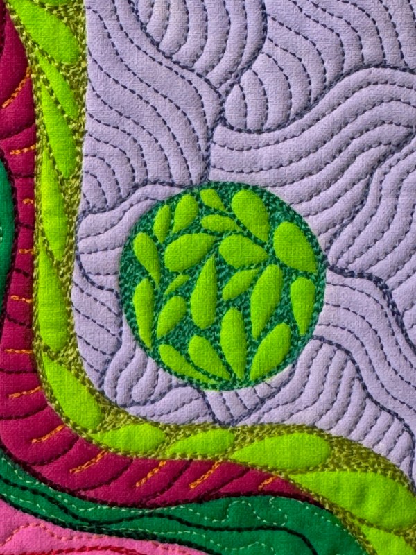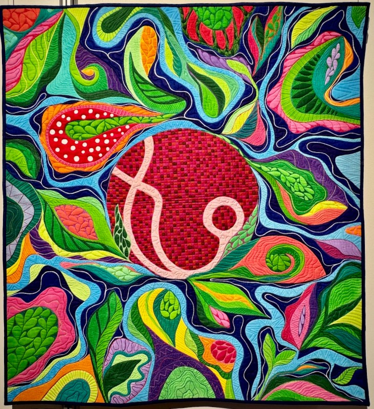She writes: “At then beginning of this year I faced my second battle with breast cancer. As soon as I could I got back into my studio and focused on small achievements each day. This is my Recovery.” And that is the title: Recovery. Technique: Painted, free-motion quilting, hand-quilting.
