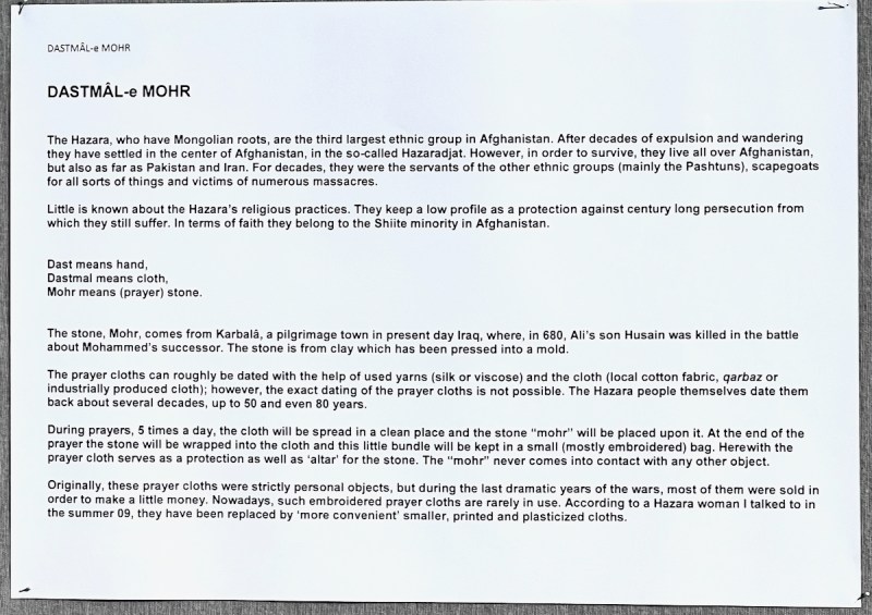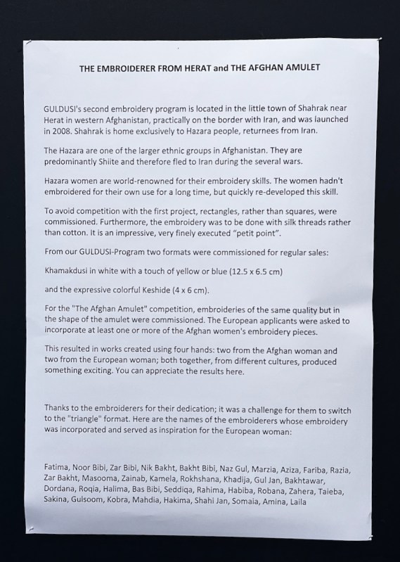 I admire and enjoy the art of these churches. The exhibit here was titled Guldisi, which is a hand embroidery program launched in 2004 (quoting from the catalogue), which “now enables 200 women in Afghanistan to support their families….Each piece will include at least one silk embroidery in the shape of a triangle, created by the Afghan Woman.