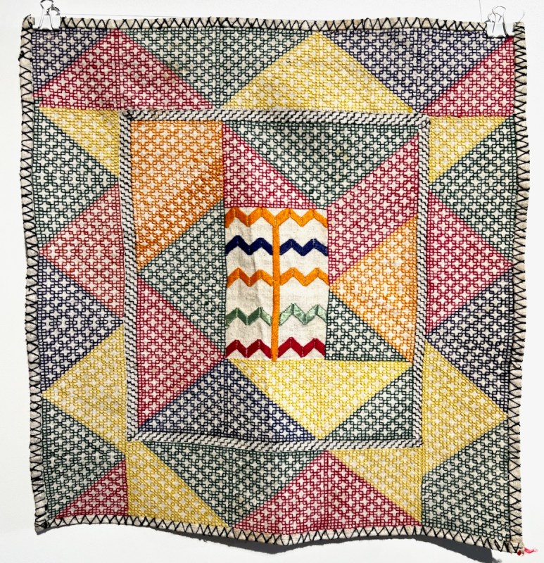 Title Card: “We three sisters spent hours together knitting, sewing, and making clothes. My eldest sister did everything well, the second was precise and skilled, and I, the youngest, just tried my best. As I embroidered this work, I often thought of them and our time together.”
