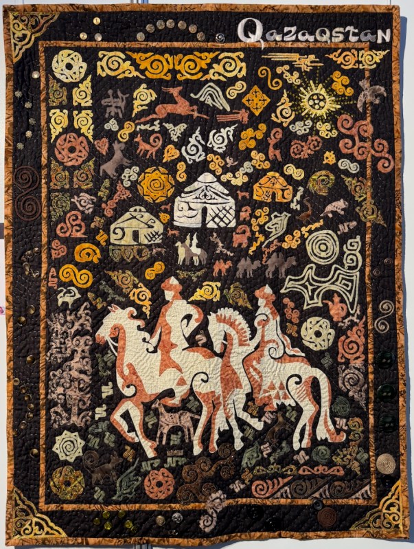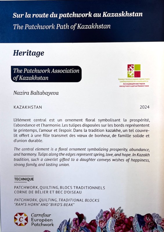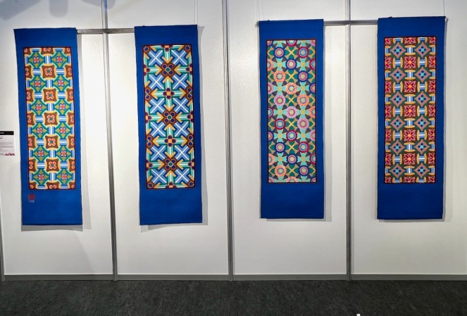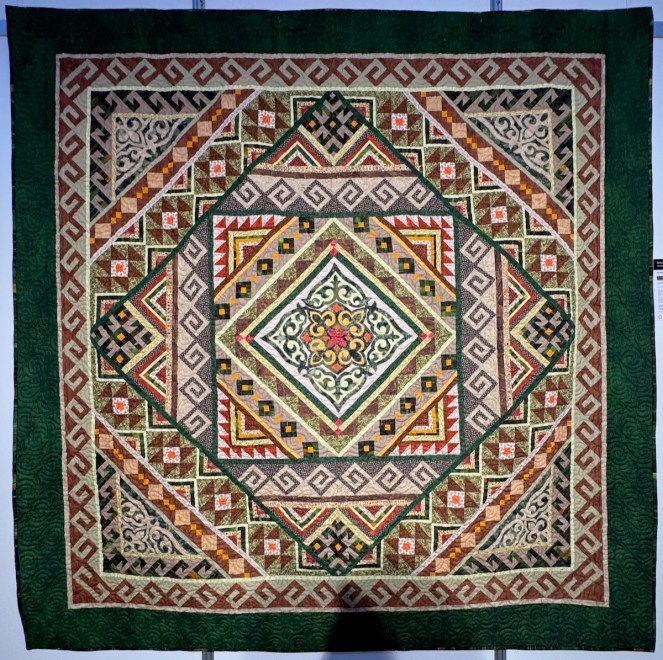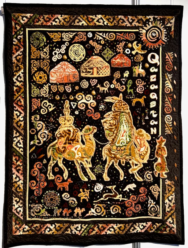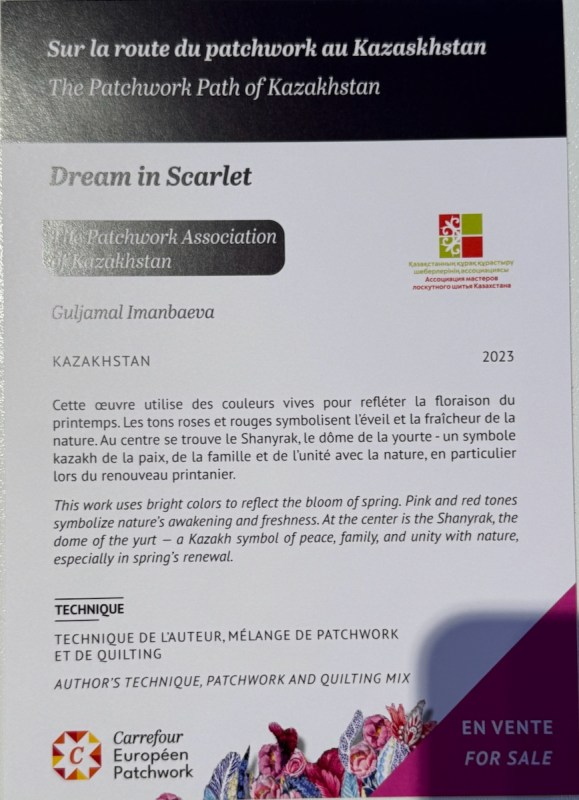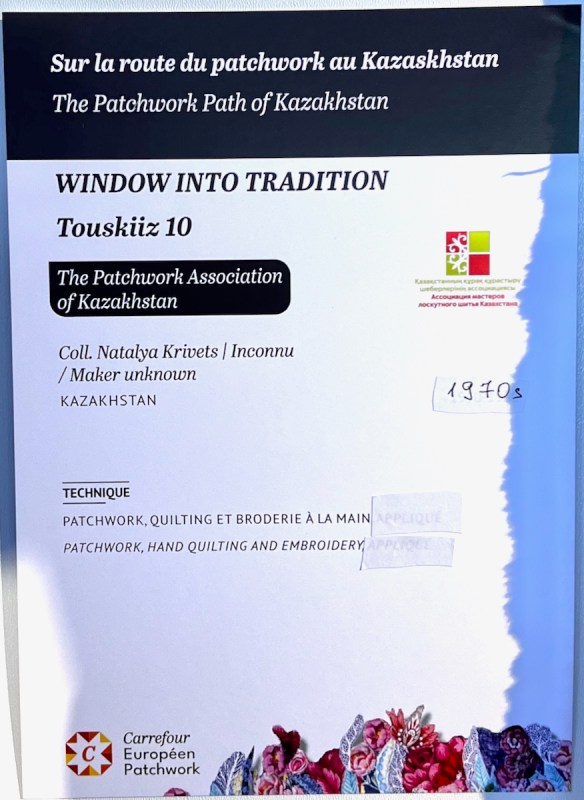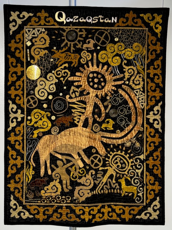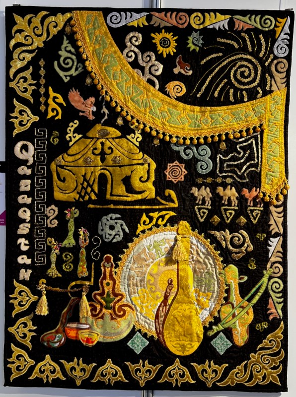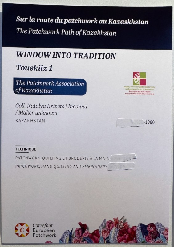 Right next to Jenny’s was the Kazakhstan quilts, a collection brought to Carrefour by the Kazakhstan Patchwork Association. This was founded in 2013, and has over 180 members “dedicated to promoting and developing ethnic-style patchwork (Kurak) and art quilts. The organize workshops, competitions, and the annual Orient Bazaar Festival.” The catalogue goes on to say that “this exhibition merges historical tradition with modern outlook in Kazakh quilting. At its heart is Tuskiiz-traditional wall coverings reflecting Kazakh nomadic culture.”