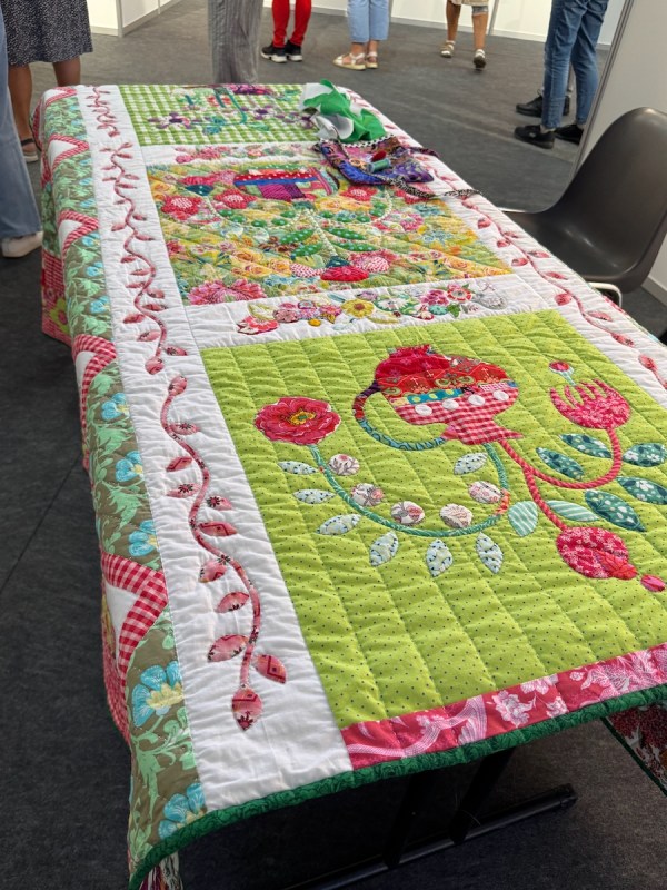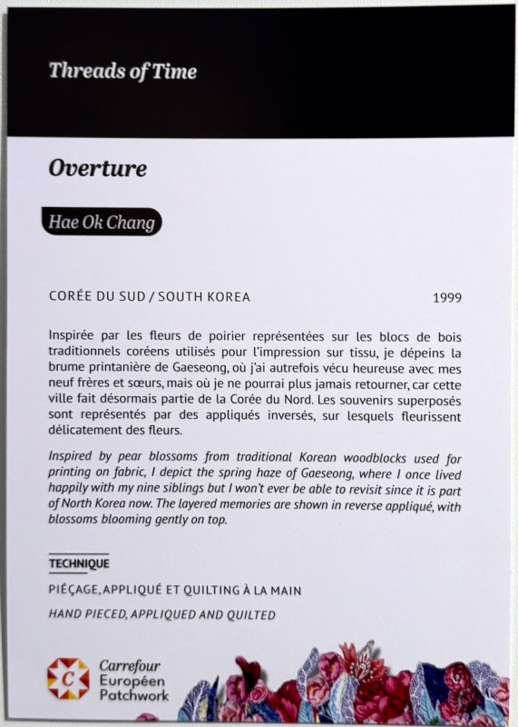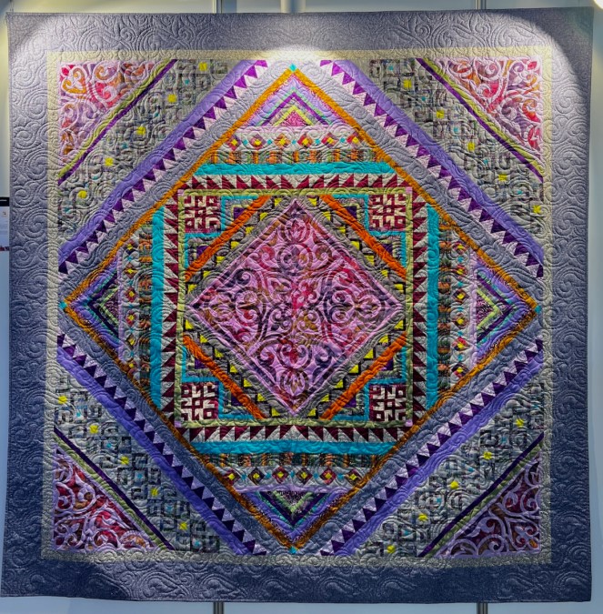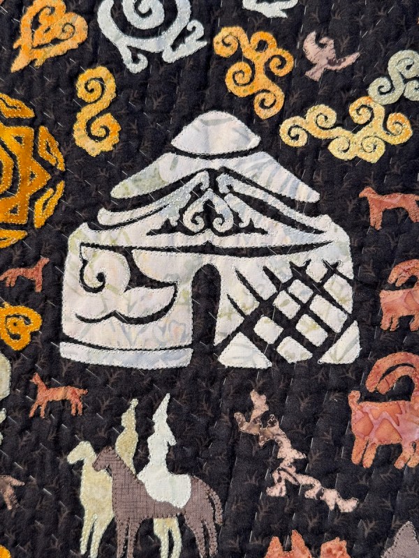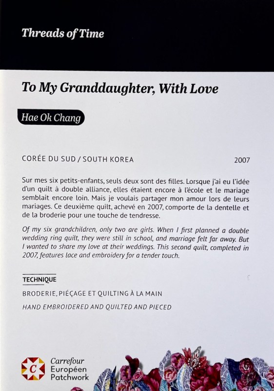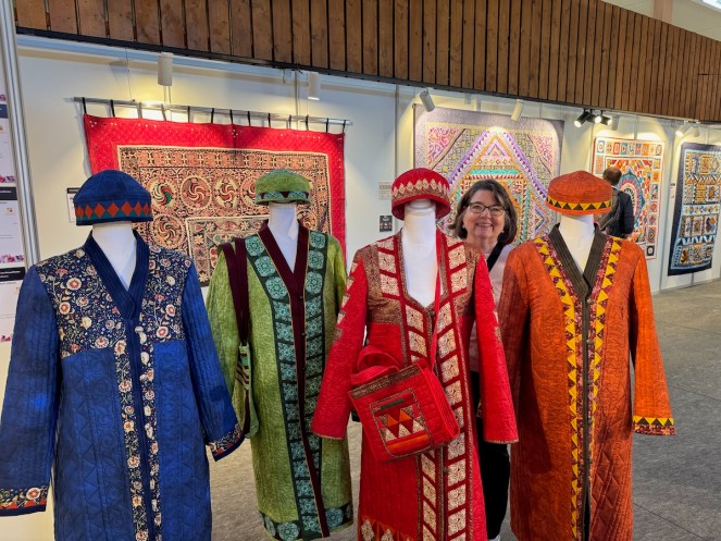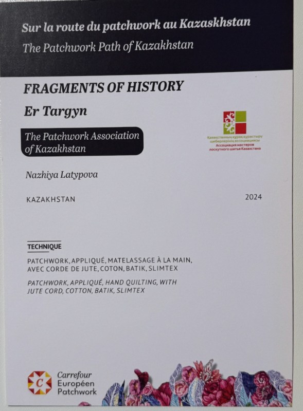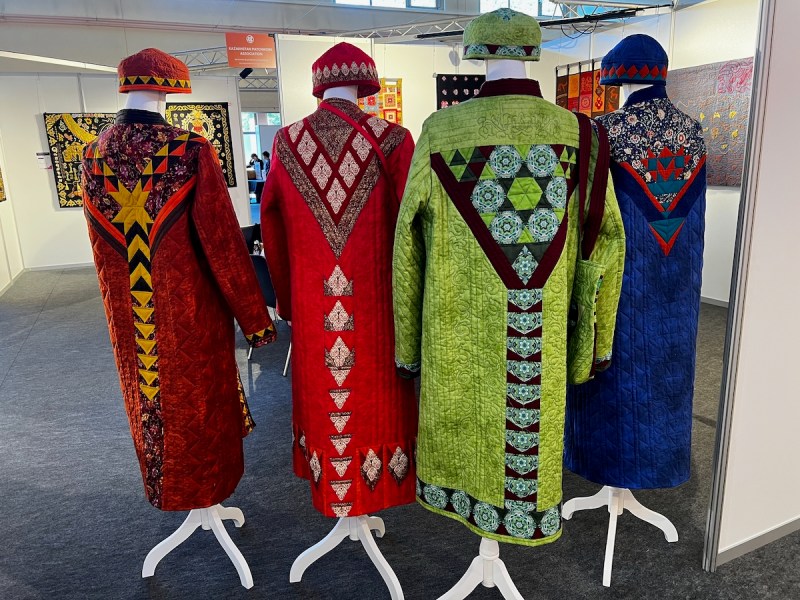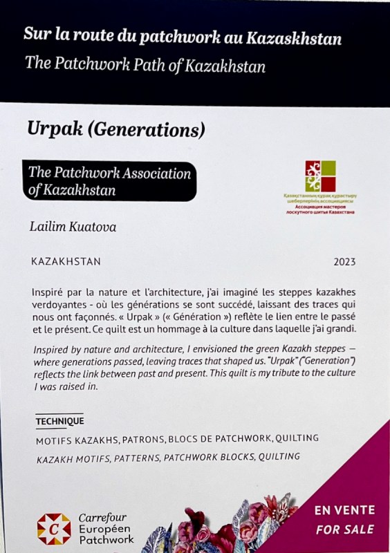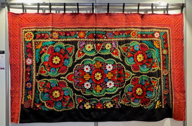 Right next to Jenny’s was the Kazakhstan quilts, a collection brought to Carrefour by the Kazakhstan Patchwork Association. This was founded in 2013, and has over 180 members “dedicated to promoting and developing ethnic-style patchwork (Kurak) and art quilts. The organize workshops, competitions, and the annual Orient Bazaar Festival.” The catalogue goes on to say that “this exhibition merges historical tradition with modern outlook in Kazakh quilting. At its heart is Tuskiiz-traditional wall coverings reflecting Kazakh nomadic culture.”