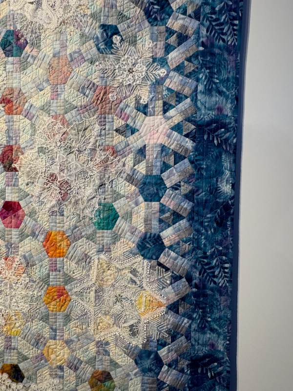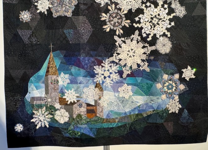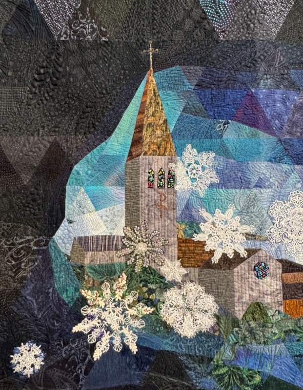 She writes: “Hesitating to start a large piece as my strength waned with age, I began a joint work with my daughter. She created the background, I made the snowflakes. Inspired by the night sky over St. John’s Catholic Church, it evokes angel wings and a chorus of family and friends” (from title card).