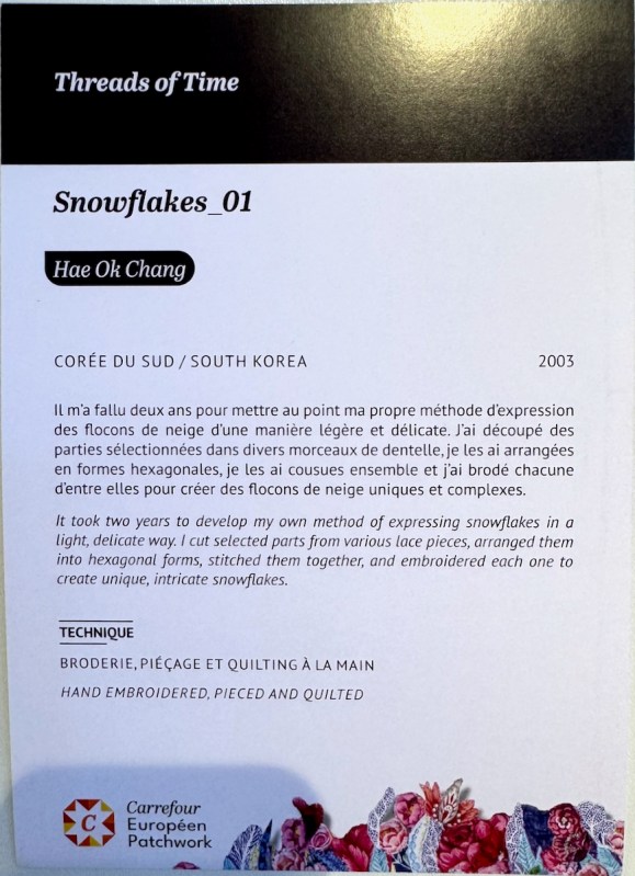 Hae Ok Chang, from South Korea, blends Korean and Western influences in a style that ranges from contemporary to traditional. One of her more well-known quilts has snowflakes on a traditional pieced quilt: