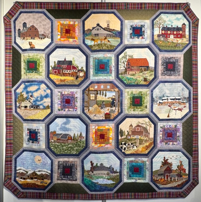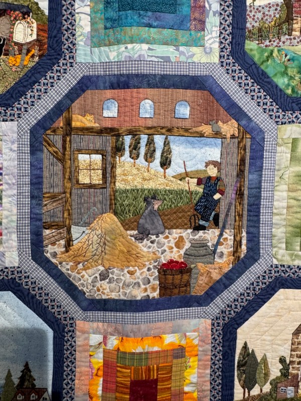 This quilt was made in 2012, after her husband passed away. Title: Time and Seasons.