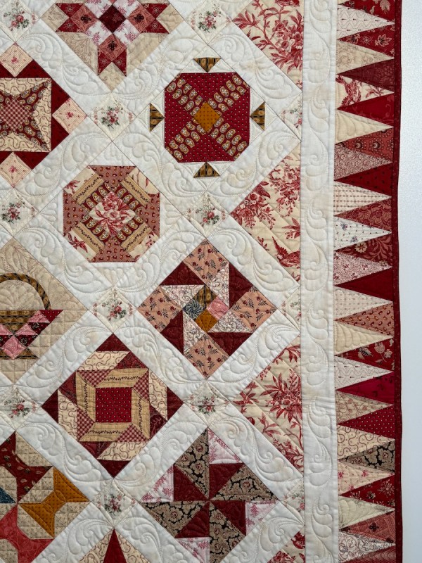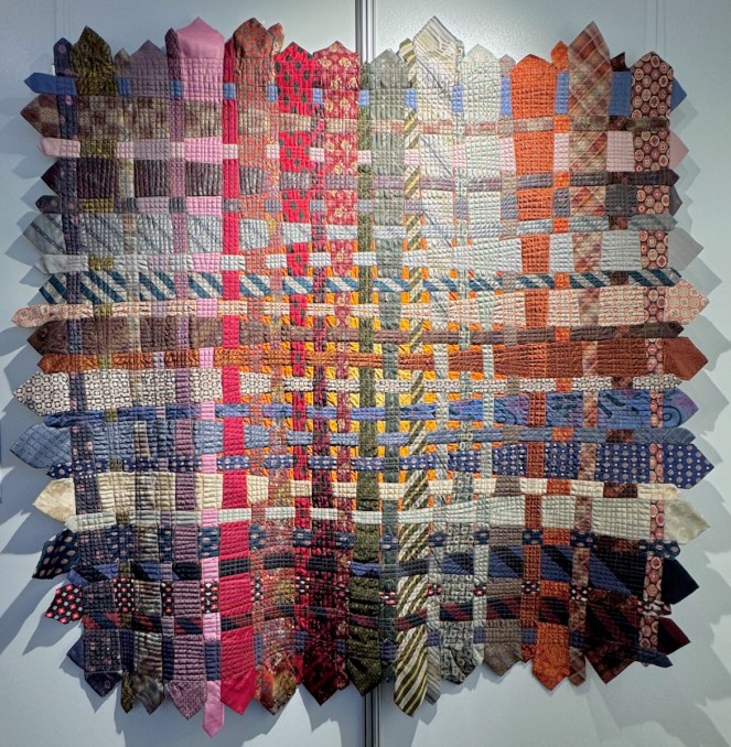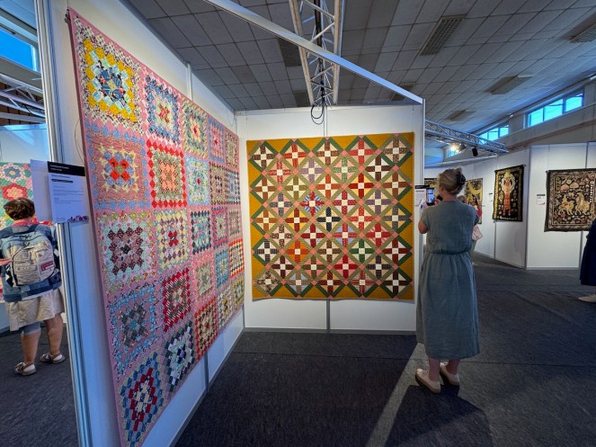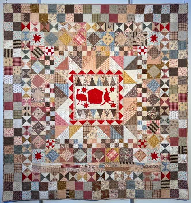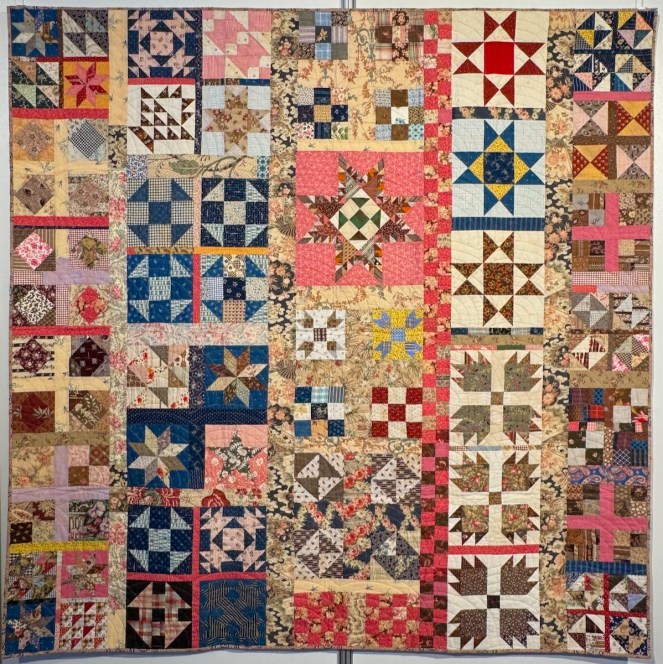 This is Sweet Georgia Brown, from 2023. She writes: “Using antique fabrics dating from around 1840 to 1910, this hotchpotch of oddment blocks was inspired by an early twentieth century piece featured in “Unconventional and Unexpected” by Roderick Kiracofe, a book that has inspired many a quilt of mine. Many of the blocks were gifts from friends or purchased from Jane Lury and David Hubert. It is indeed happily scrappy.”