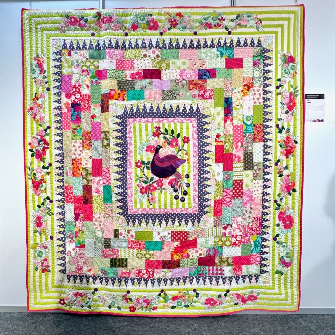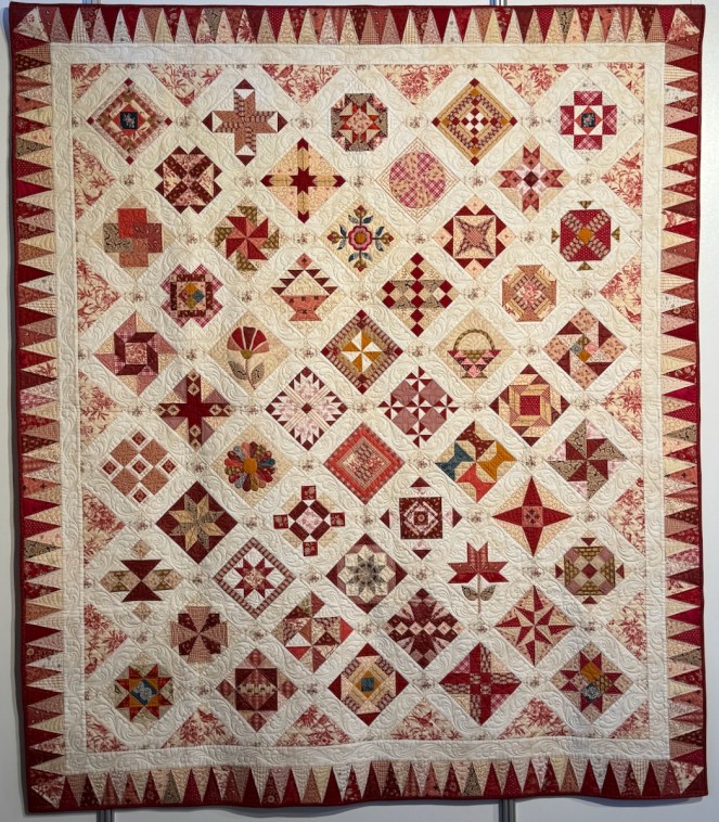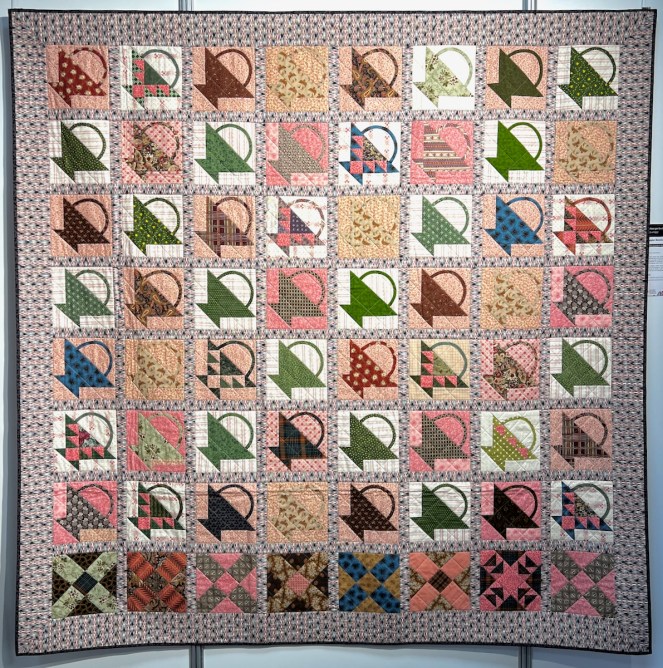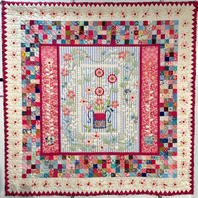 Last one of Jenny’s is Scrappier Bennington Baskets. It is made by Jenny Bear, but quilted by Karen Terrens. The title card says: “This is a scrappier version of Linda Collins’ “Bennington Baskets” featured in her book with Quiltmania “Treasures from the Barn.” The basket block is traditional but the setting is quite quirky, especially with the row of oddment blocks at the top in the original, but at the bottom in my version.” Mixing blocks is a great idea, one to try for sure.