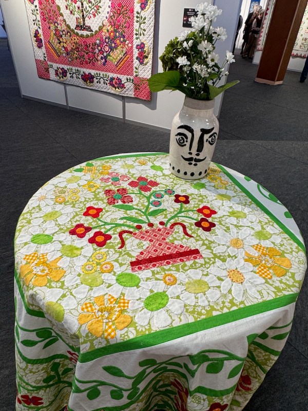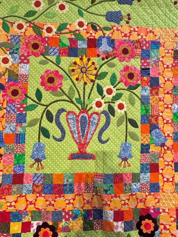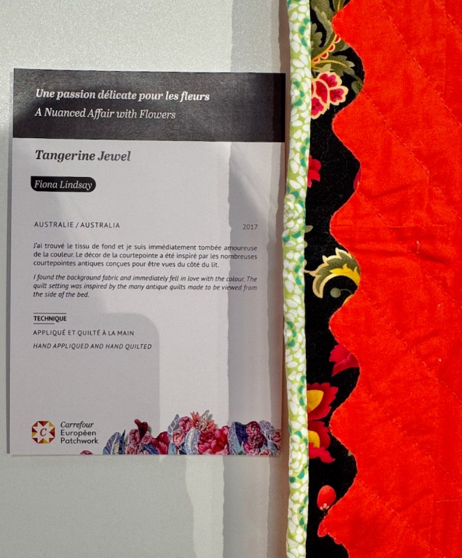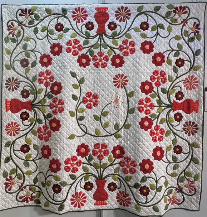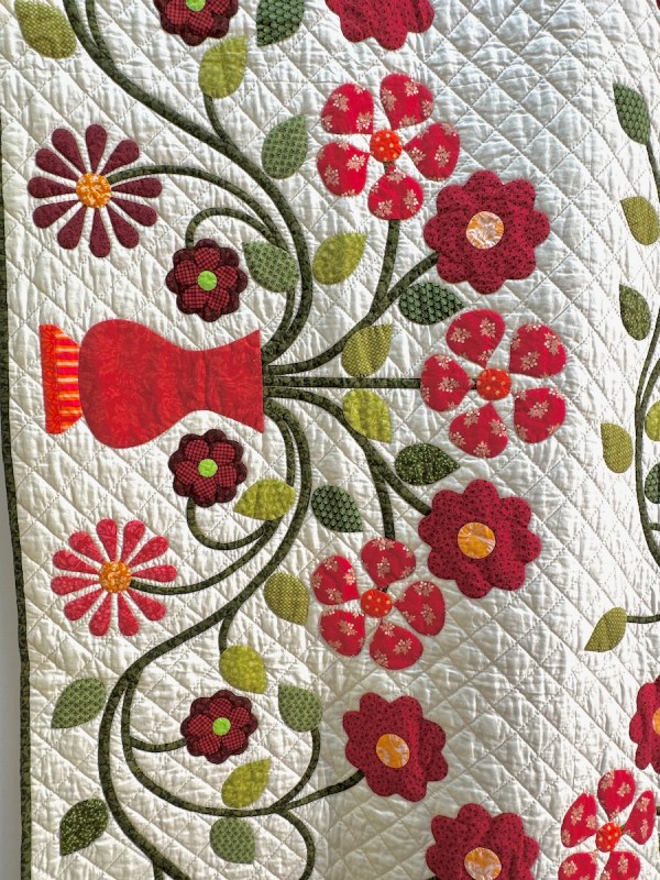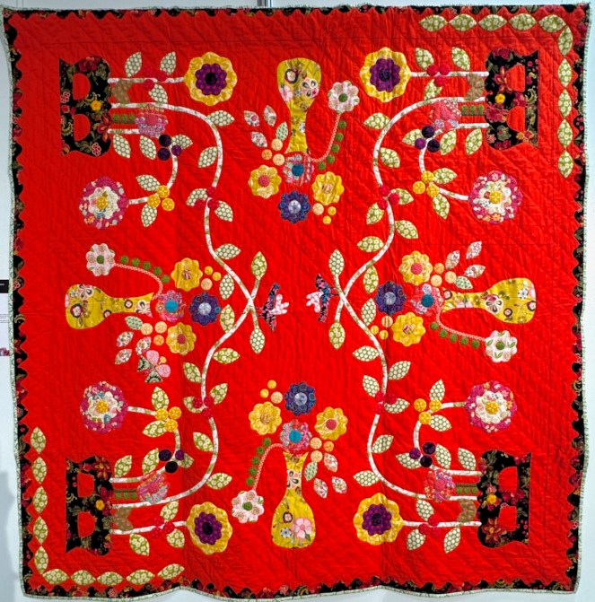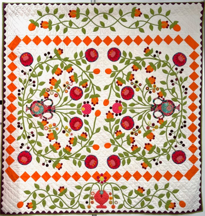 One reason why I do these posts from Carrefour is not only to introduce you to new quilting artists, and to let you glimpse the passions from around the world (which Carrefour is so good at bringing together), but also as sort of a reference book for our own designs. Who would have thought to put a Baltimore-style urn of flowers together (above) with a wild vine running free from tiny pots in the corners? Yet it all works with that pieced border and the wild orange Kaffe fabric sashing. Here’s a closer look: