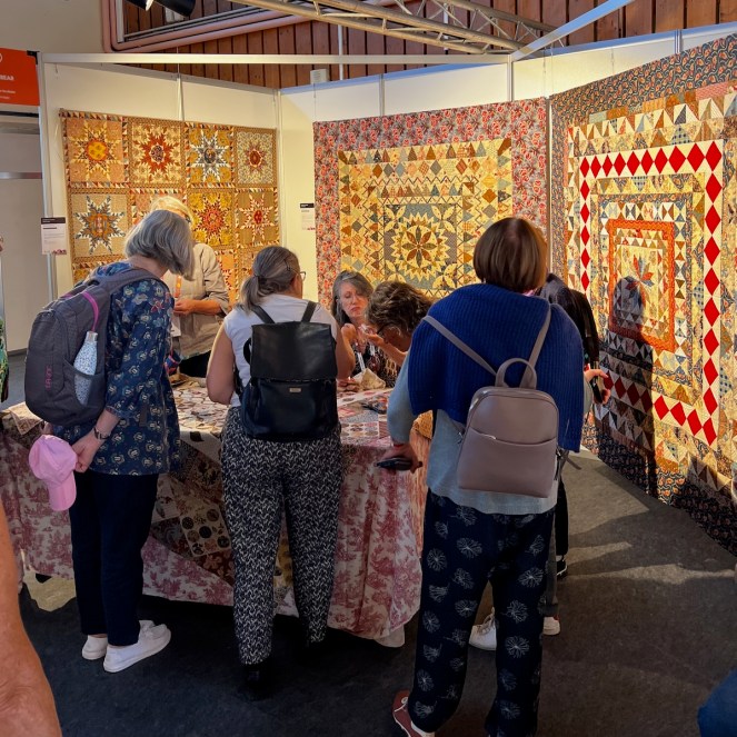Hopefully you can hear the bells. Right after this, we went for a take-out lunch from the local market. The choices were rather cleaned out, but we found something. There were a lot of quilters there — so happy to see this!