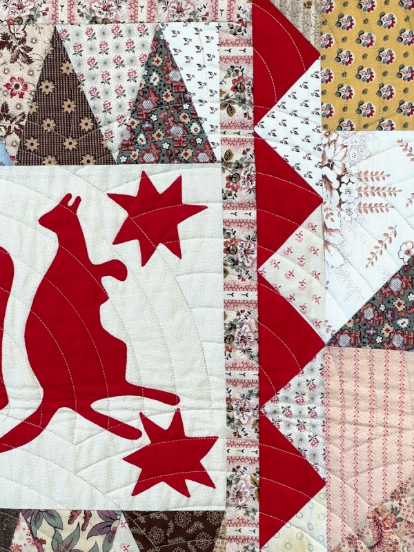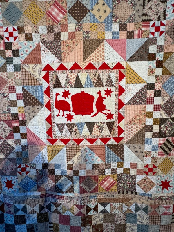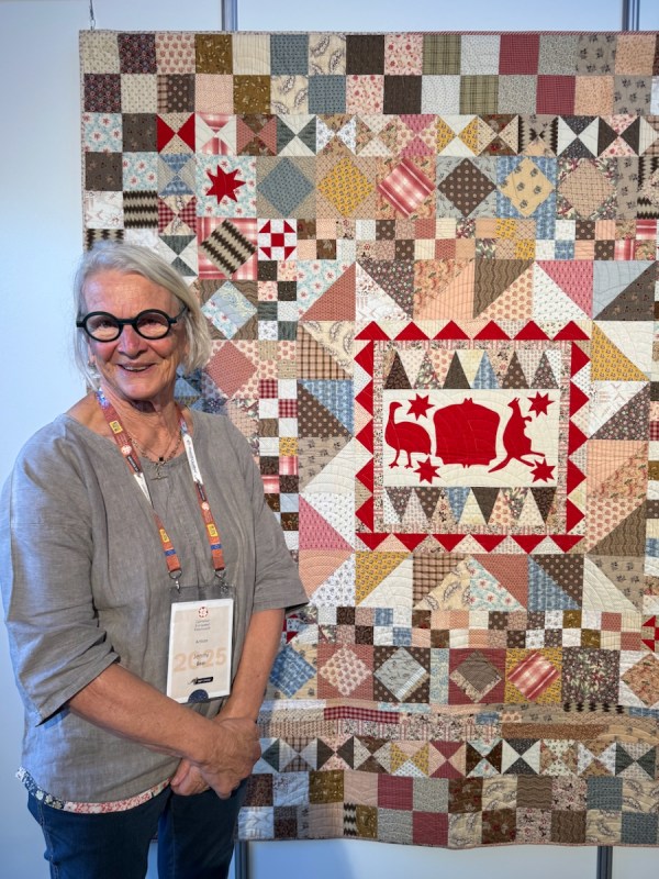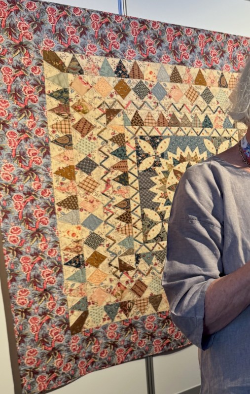 And we meet Jenny Bear! She is a renowned quilter from Australia, known for her scrappy quilts, but exquisitely put together. The catalogue called her “Happily Scrappy” and said that “Jenny’s quilts are a celebration of social history, fabric, color, frugality, and the art of making do. She loves using her stash of antique, vintage and reproduction fabrics as well as rescuing old, unquotable or broken tops, fragments, orphan blocks and tiny scraps to make something beautiful from them. Her favorite quilts are simple, utilitarian and achievable by anyone who loves to sew.”