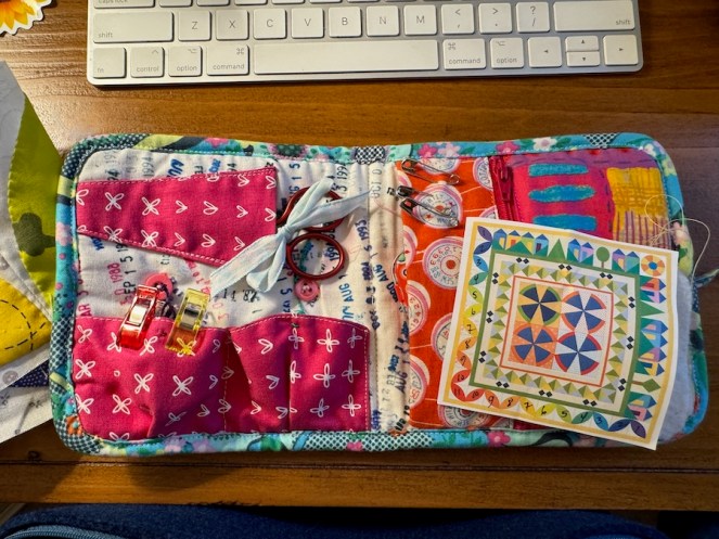 Finished, and putting away my recent birthday present from my husband: red scissors. I often carry around a small image of what I’m working on, as I sew in many places. This round it was my son’s home, a long car ride, and a doctor’s office where invariably someone asks what I’m doing.