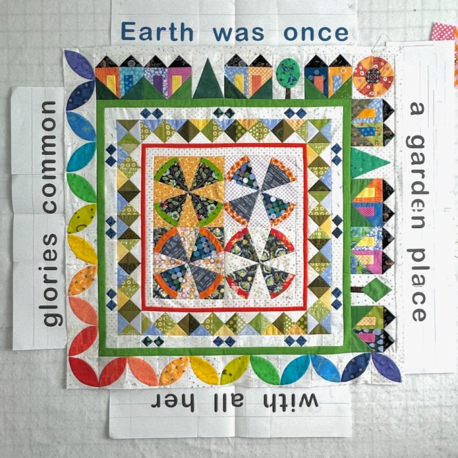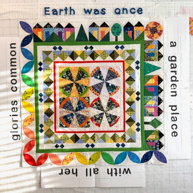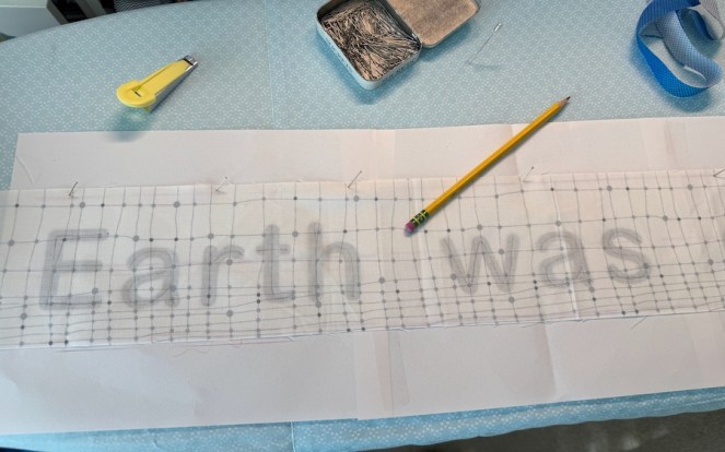 I’ll explain the words when I present the quilt on its final QuiltFinish post, but suffice it to say they have meaning for me at this point in my life. Lots of words, it looks like, and how to get them there? I didn’t want to cut them all out and appliqué them, so I decided to take the Lori Holt approach, that I made in one of her quilt designs: