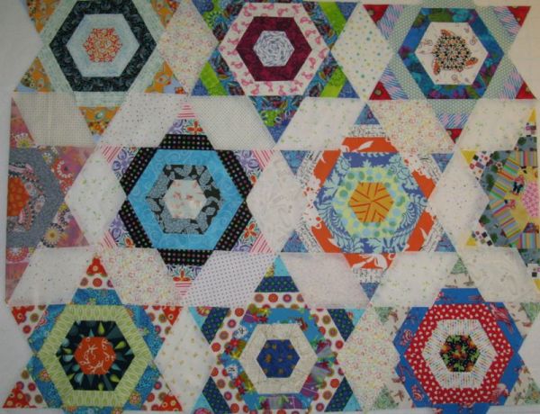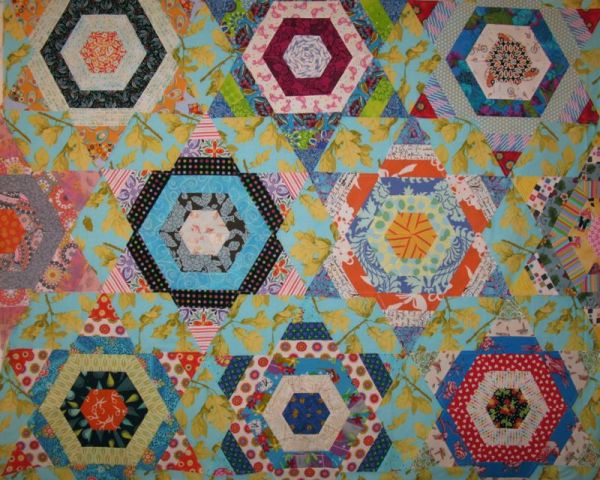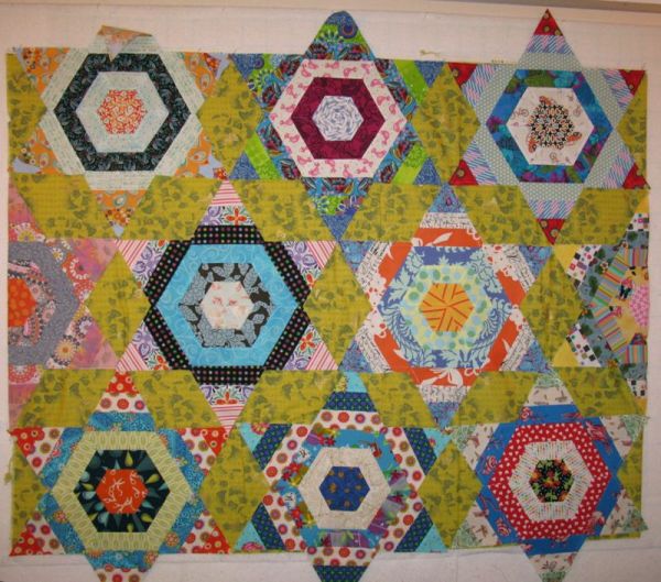 I had gone to the fabric shop on the way home from school on Friday, and yes–the hot pink with the purple dots didn’t work as well as the Kaffe Fassett Stencil fabric, in two-tones of green. I liked it . . . but I didn’t love it. And remembering what Elinor and Bert and others had said, I knew it had to sing to me. I didn’t touch the quilt all weekend. I would walk in and out of the studio, did a day’s work on grading and lesson prep, ignored it, studied it. I unfolded the half-stars, arranged them all neatly and went to bed Saturday night.
