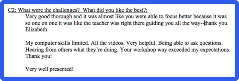 The afternoon was a series of lovely moments, as they held up their successes to the camera, showing off what they’d accomplished, bit by bit, section by section. I told the class that if they sent me decent photographs of what they’d been working on, I’d put them into a slide show for them to see when we all got back together a week later, in our planned Wrap Up Class.