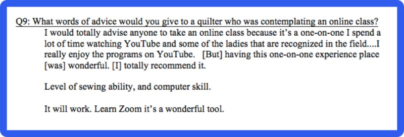 Before we parted, we talked about the pros and cons of this situation (and they agreed to fill out a survey after the fact). One comment was that they didn’t have to lug their sewing machine down the stairs to their car. Another quilter mentioned that she had been able to pivot quickly when it was apparent that the choice of fabrics she’d laid out weren’t working: all her fabric was right there around her. I also love what this anonymous quilter from our class wrote in her survey: “Learn Zoom–it’s a wonderful tool.”