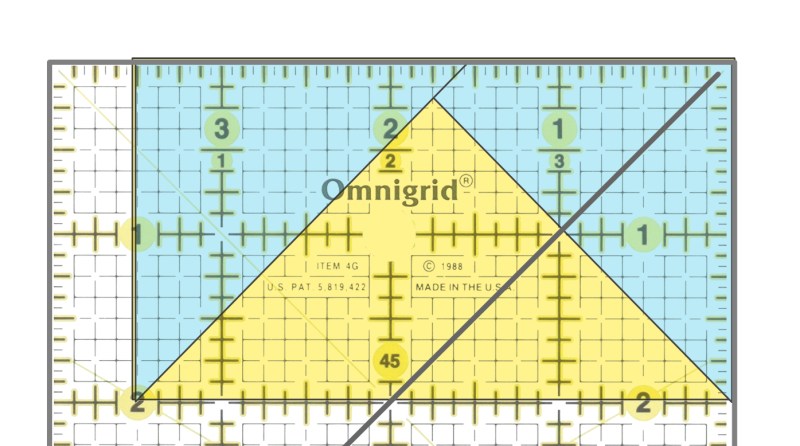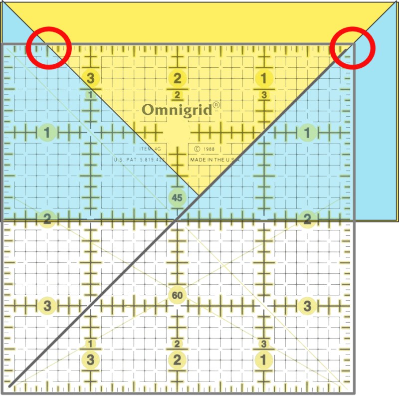 Step Two: With the flying geese point FACING TOWARDS YOU, line up the ruler’s diagonal line with that right-hand folded edge.