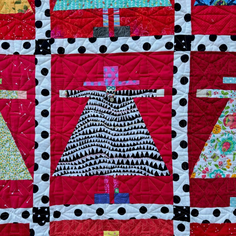 To cut out the shape: I would often iron on my freezer paper version of the pattern (I just printed it directly from the pattern). Other times I would just use a pin. Always I used my rotary cutter to slice around the fabric, and usually I was working with four layers of one polkadot fabric. (I learned in this project how many many many polkadot fabrics I have.)