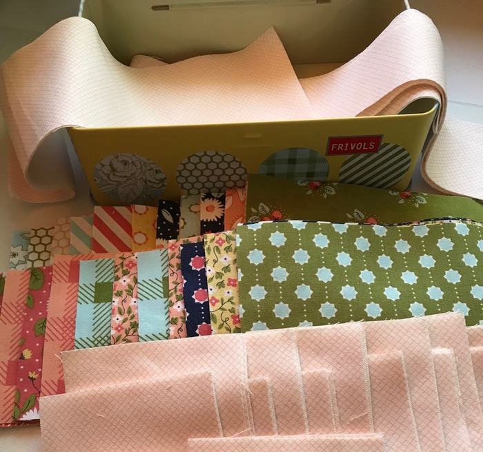 Here are the finishing up photos for this little quilt, finishing at 32″ by 36″: arranging the quarter-log cabin square, pinning, then quilting it. I didn’t have any red fabric for the binding, but in my Christmas bin, found a piece of an earlier Sweetwater Christmas line, and yes–it works quite well.