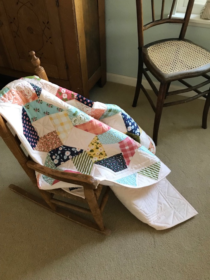 Here are the finishing up photos for this little quilt, finishing at 32″ by 36″: arranging the quarter-log cabin square, pinning, then quilting it. I didn’t have any red fabric for the binding, but in my Christmas bin, found a piece of an earlier Sweetwater Christmas line, and yes–it works quite well.