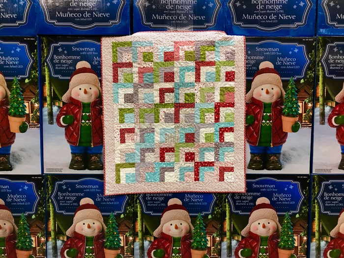 And if you answered “Christmas!!” in response to the prompt, you — unfortunately — are also correct. So to take photographs of Frivols #10 finish, done up in a Sweetwater Christmasy line of fabrics, I headed to Costco for the photo shoot. I’m calling it Christmas Corner, because all those quarter log-cabin shapes remind me of street corners.
