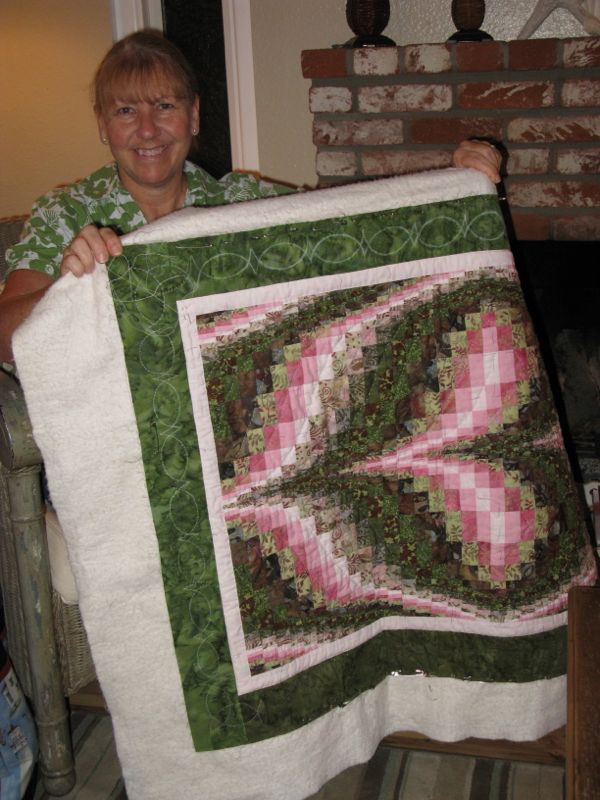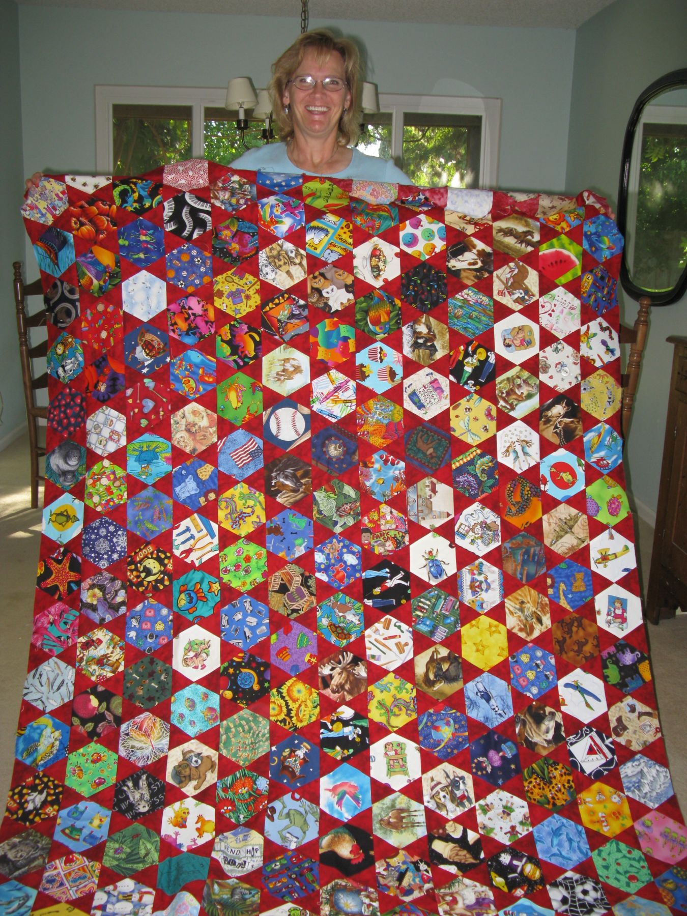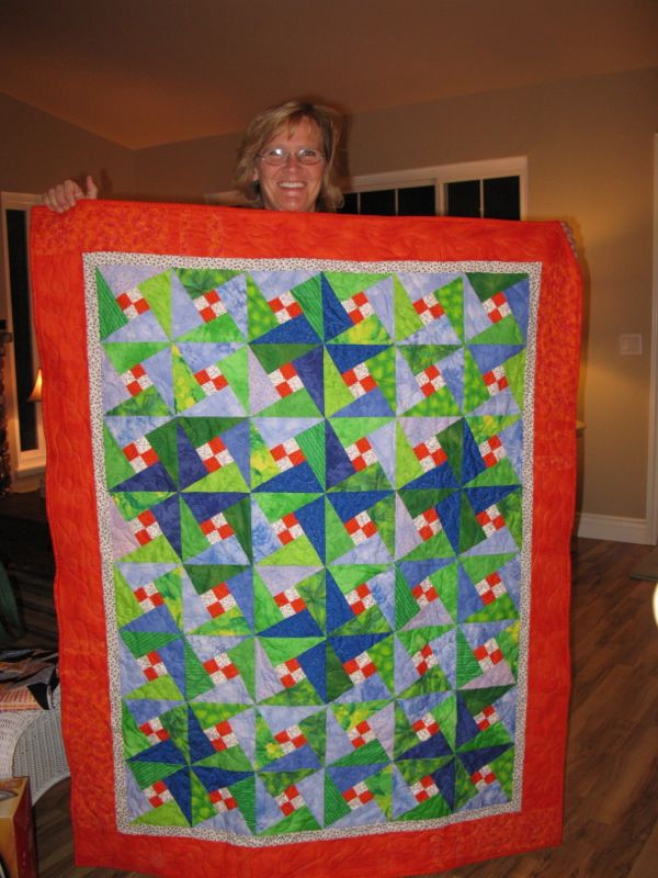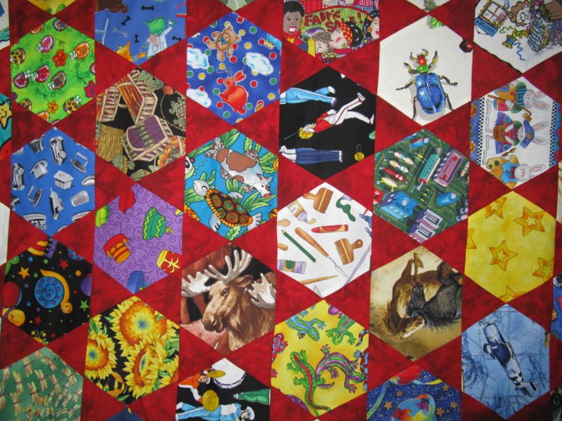 I’m past the initial confusion and aside from the bit of re-stitching I’m going to be doing in a minute, I’m enjoying this process. I’ve never done a Block of the Month (BOM) before, and it’s kind of fun to get a package and a pattern on your doorstep. It is fun to pick and choose colors in the fabric shop, I admit, as well as patterns and ideas, but this summer, given all the sturm und drang (aka “storm and stress”) of the surgery, family trips, and other sundry complications in my world, it will be nice to have part of the creative process simplified. This is my inspiration (the finished quilt top) and I look at it often: