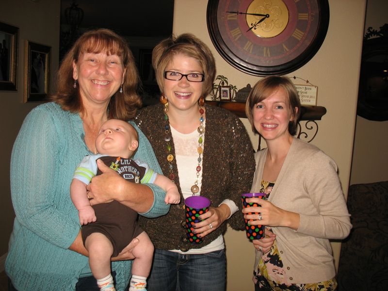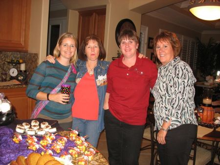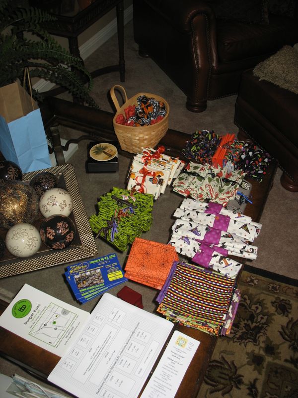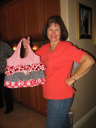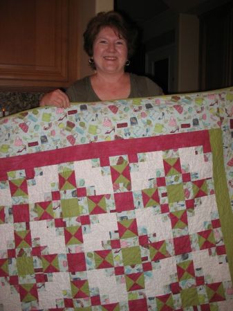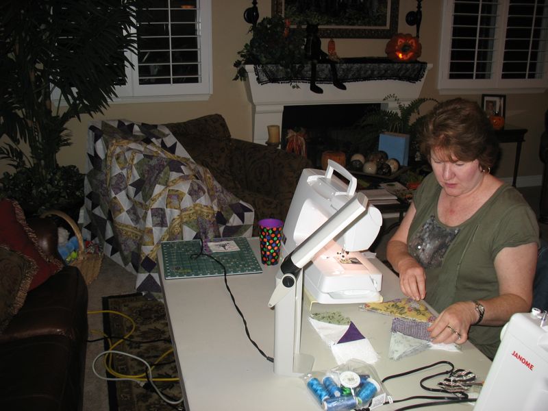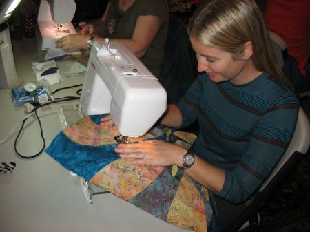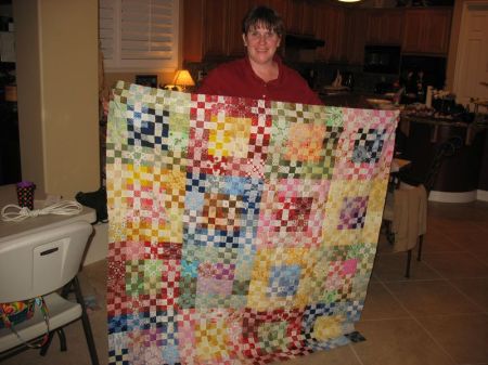 Our group has changed, shrunk, expanded and changed again, but the core members shown in this photo are me (2nd from left), Lisa (in bright green shirt) and Leisa (on far right). JoDy is in the red-stripey shirt, Jean is next to Leisa on the right and our newest member is Carol, just moved here down from the mountains near our city. Our first unofficial meeting was when Lisa was pregnant with her daughter when she helped us tie a quilt for my son. Her daughter is now 15 1/2.