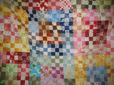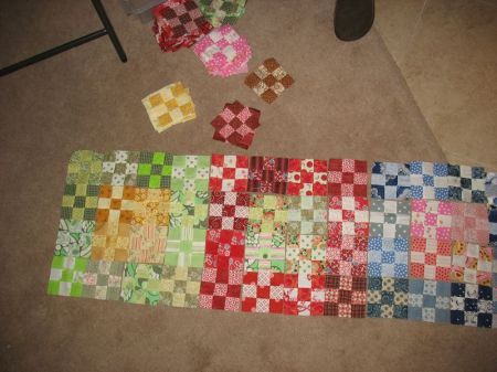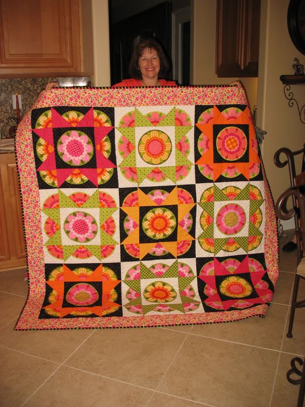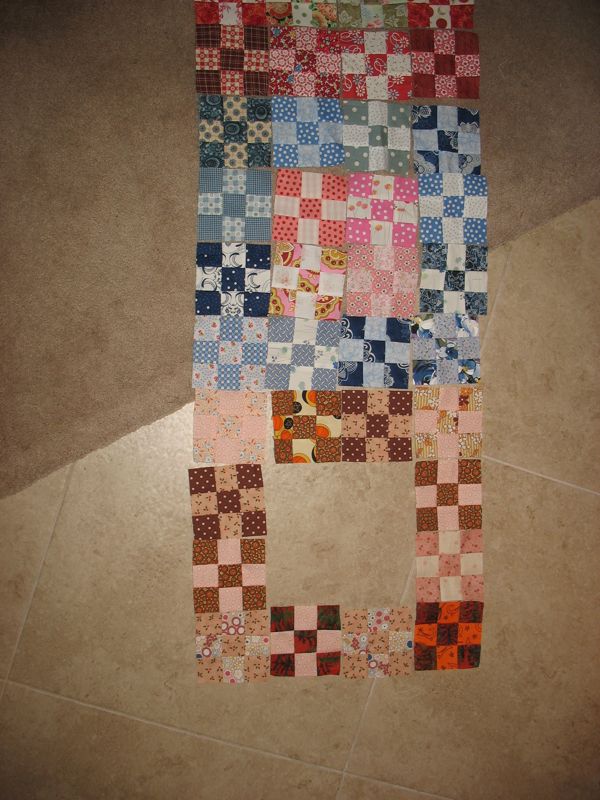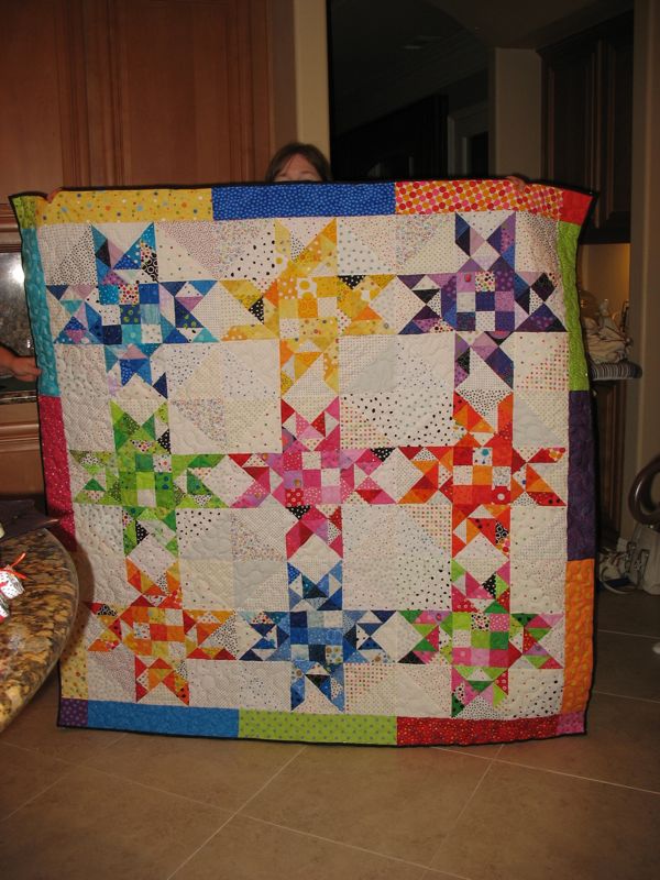 Here’s a slideshow of our day, with lots of finishes. The blue quilts with all different patches is another one we did together, when we had about 12 members. Lisa was “headed for the borders” all day long, getting things done. I didn’t catch a photo of Carol’s finishes, but she was working on flannel rag quilts for charity–the local hospital, and you’ll see Karen working on her bargello quilt.