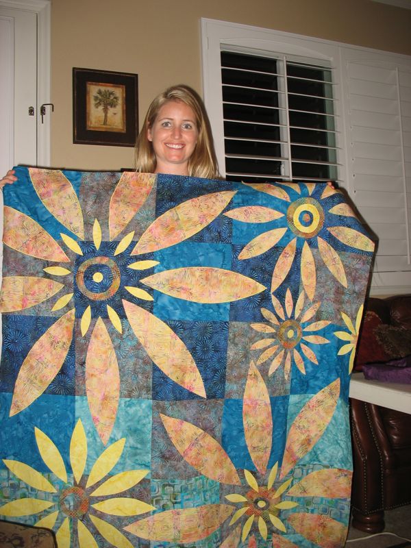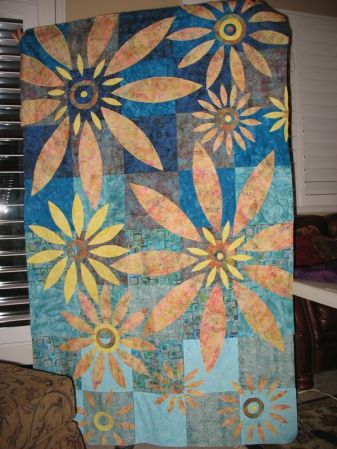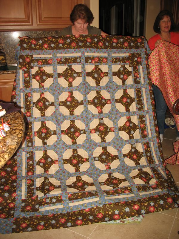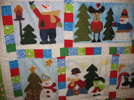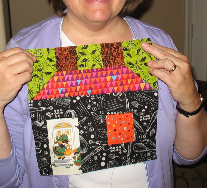 I’m leading with this shot of a houses quilt, because this was the very first project our group, the Good Heart Quilters, had ever done together. I designed all the houses on my QuiltPro quilt program, passed them out. Leisa and I went shopping and bought two fabrics, and we passed them out. The requirements: make eight houses all alike, using pieces of the two fabrics. The trees were created by each individual quilter, as well as the setting. When we met yesterday at Lisa’s house (a different one that the above Leisa), she was busy putting borders on everything and found this first quilt. I was glad to see it again.
