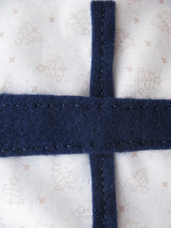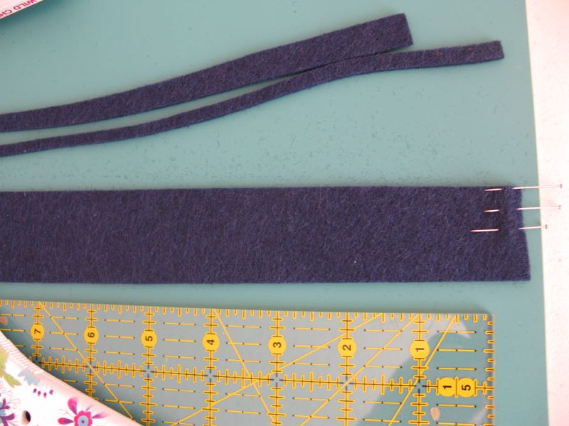 She writes “Once the fabric flowers are on, Wendy just cuts the felt circle free hand, keeping an even margin around the fabric. She says it’s meant to look hand made, and the circle doesn’t need to be perfect. Keep the scissors in the same position and turn the felt with the other hand, rather than cutting around corners. Use very sharp scissors with medium length blades. Not tiny embroidery scissors, not huge dress making scissors. I use the orange ones in this photo.”